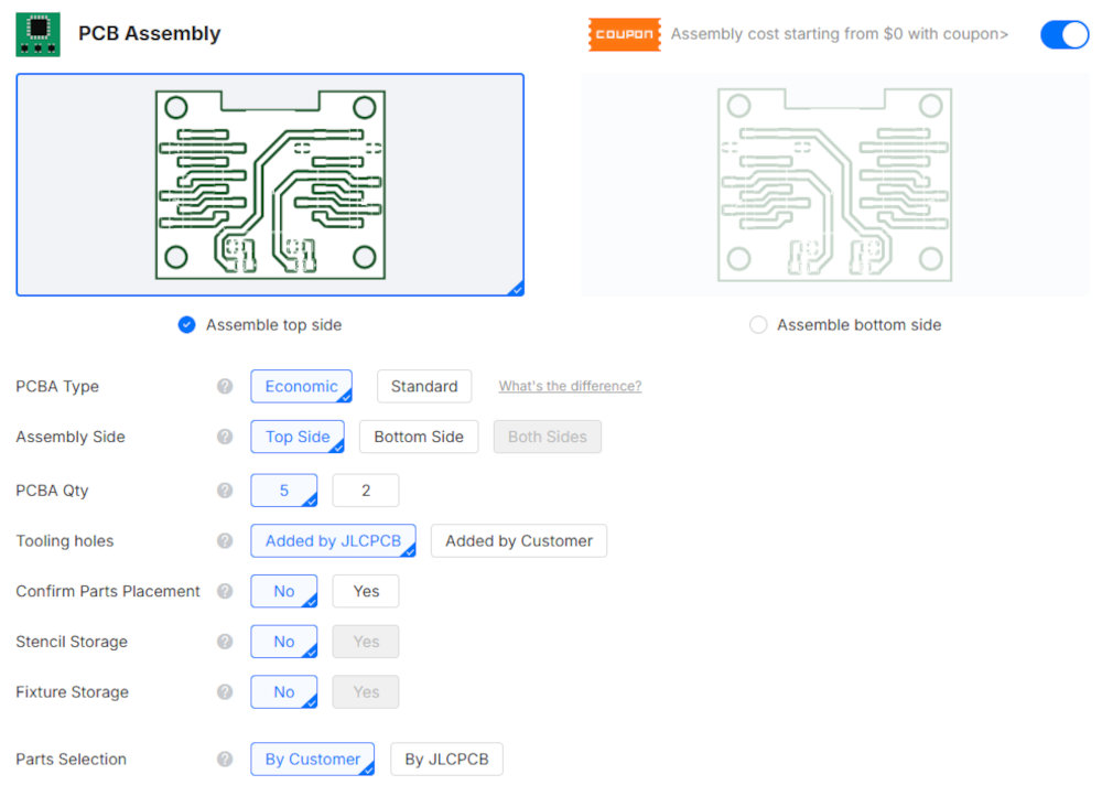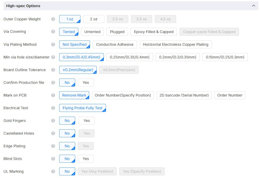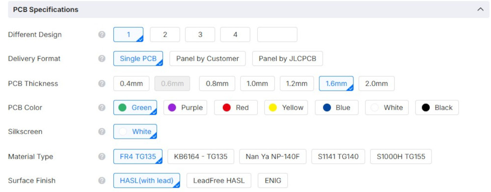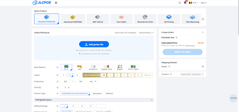 Now I can get creative and choose : the base material (FR-4, flex, ...), the numbers of PCBs to order, the color of my PCB, the outer copper weight and something I usually choose, the assembly, this gives me the option to receive my PCB with the components (if they have it) already soldered on it, this increases the price since you also to buy the components.