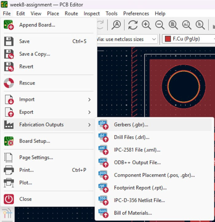 I'll try the Bantam first, before using the machine, I need the fabrication files to work with. For that, I go to KiCad and export the useful Gerber files (go to File, then Fabrication Outputs and select Gerbers(.gbr)...).