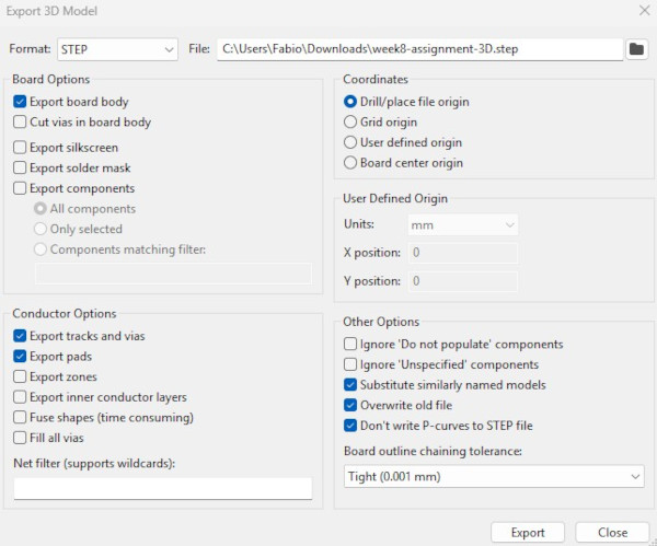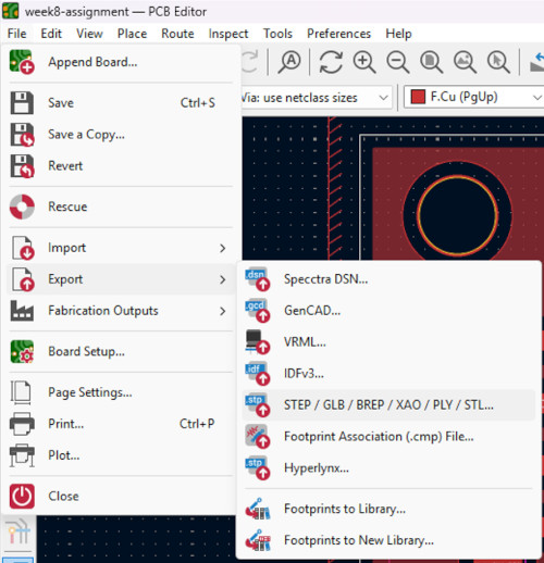 Then, via KiCad, I export the 3D model of my PCB. I need to go to File, then Export and select STEP/GLB/BREP/XAO/PLY/STL....