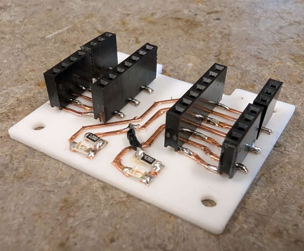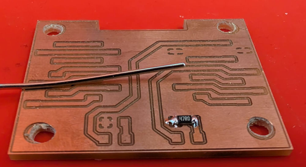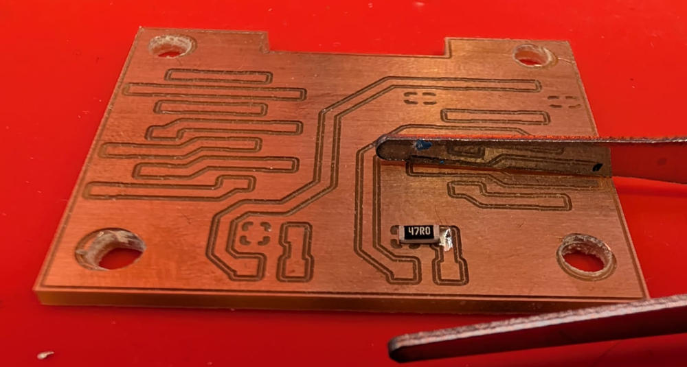 For the placement and soldering of the tiny components, in my case, the resistors and the leds, I first put a bit of solder on the PCB.