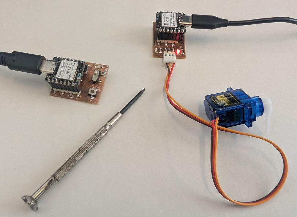 They are 2 PCBs, one for the inputs, which are one potentiometer and a button and one for the outputs, which are one servomotor and one LED.