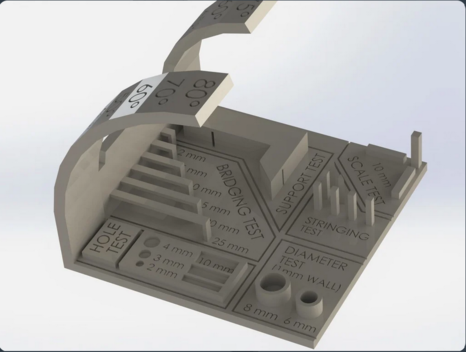 This week I will only use the Prusa ones therefore I will only test the design rules of the latter. To test the design rules, Patrick showed us a quite convenient object to print that looks like a small board containing different design rule tests.