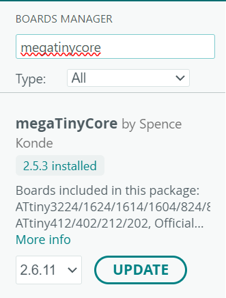 First in first, I installed the board on Arduino IDE. One has to install megaTinyCore by Spence Konde to work with ATTinies :