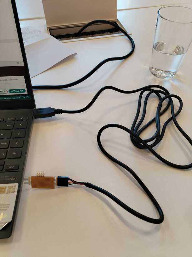 To recall, my board was designed in order to be able to program and communicate with it using a USB port and a FTDI converter. I then connected the board to my computer using such a cable :