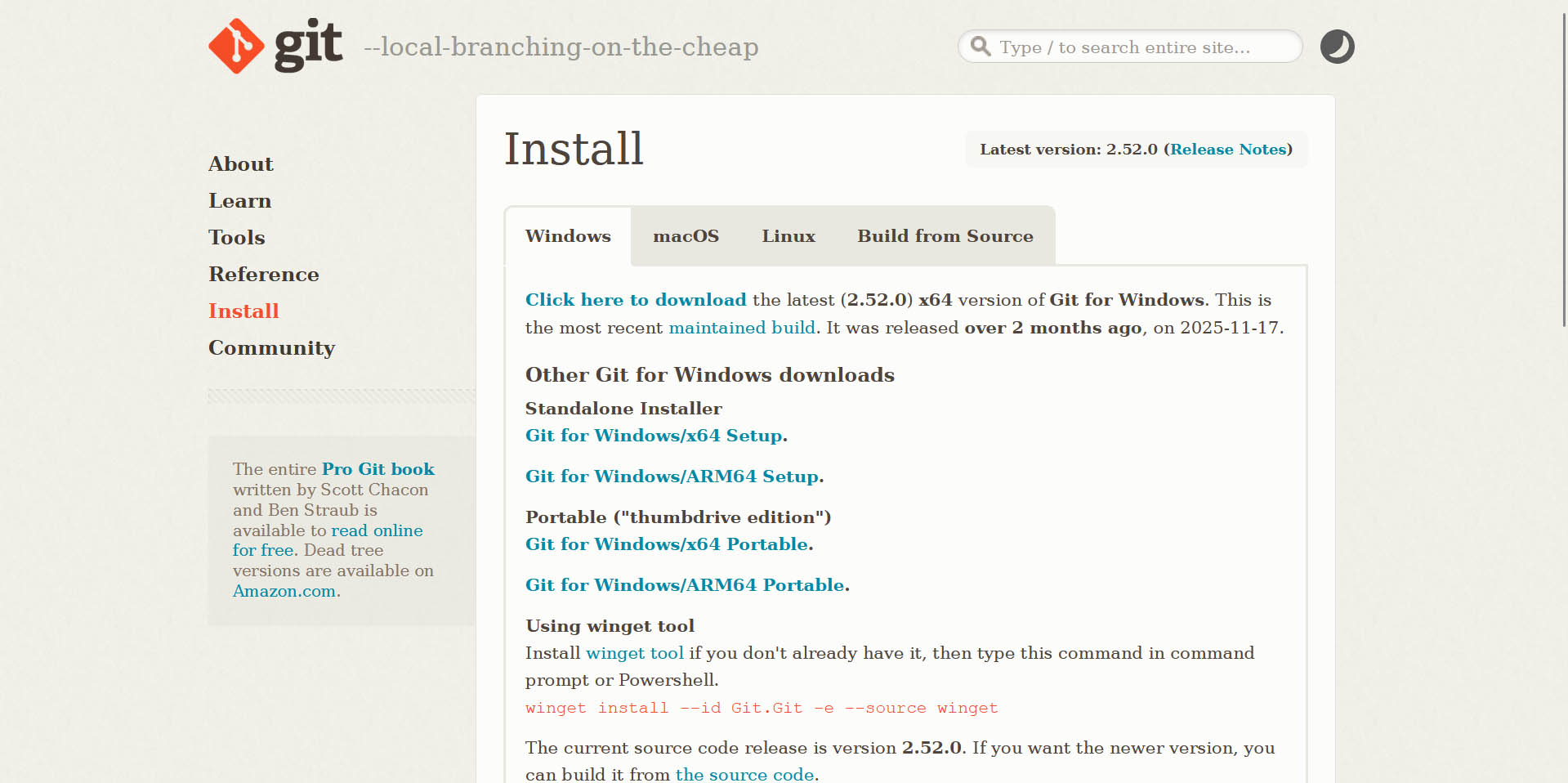 The second step is to install Git on my laptop. To do so, I went to the Git official website to download the latest (2.52.0) x64 version of Git for Windows. Available here: Git.