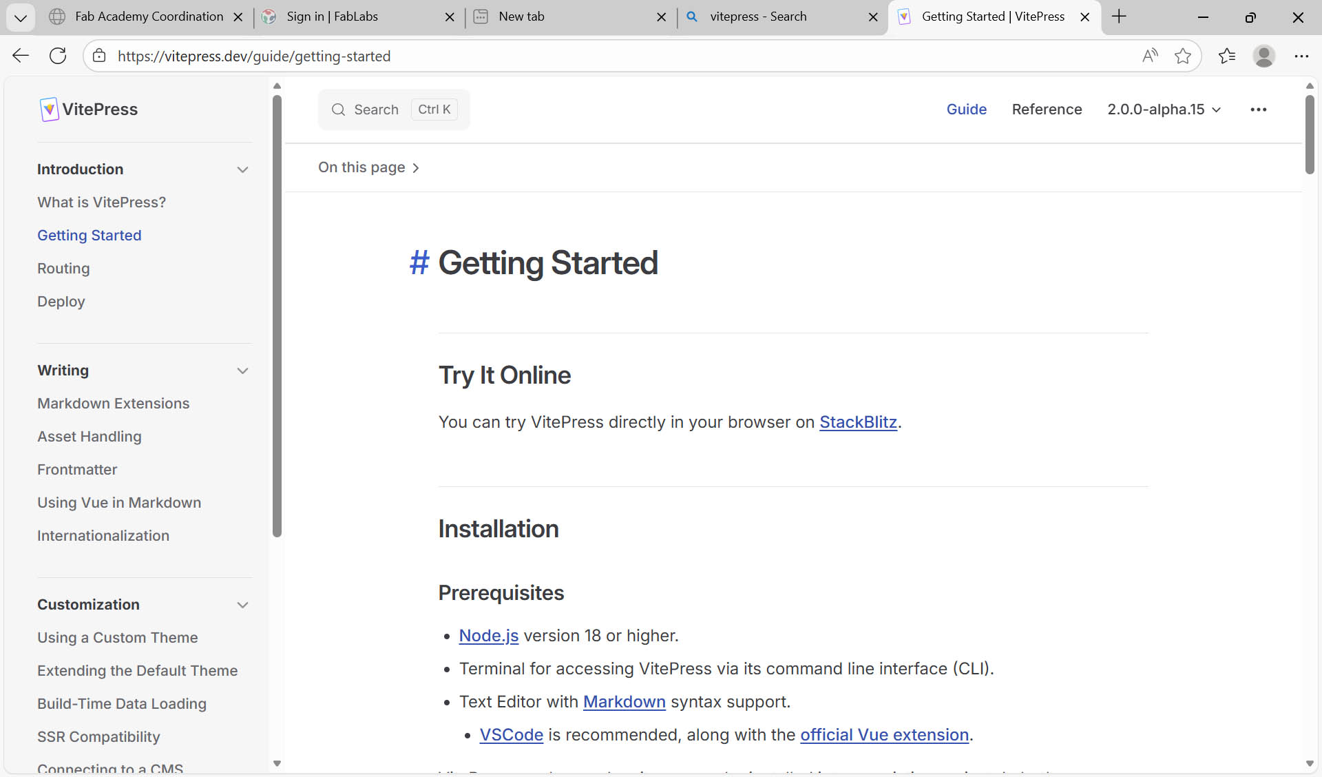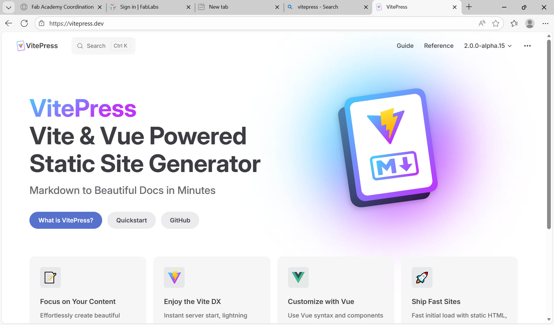 I decided to use VitePress to build my Fab Academy website. It is “a Static Site Generator (SSG) designed for building fast, content-centric websites. In a nutshell, VitePress takes your source content written in Markdown, applies a theme to it, and generates static HTML pages that can be easily deployed anywhere”. Source: VitePress / What is VitePress.