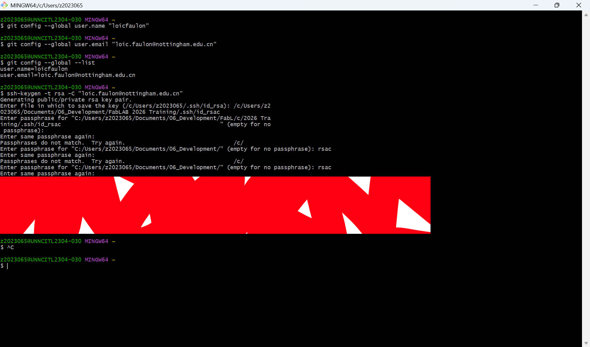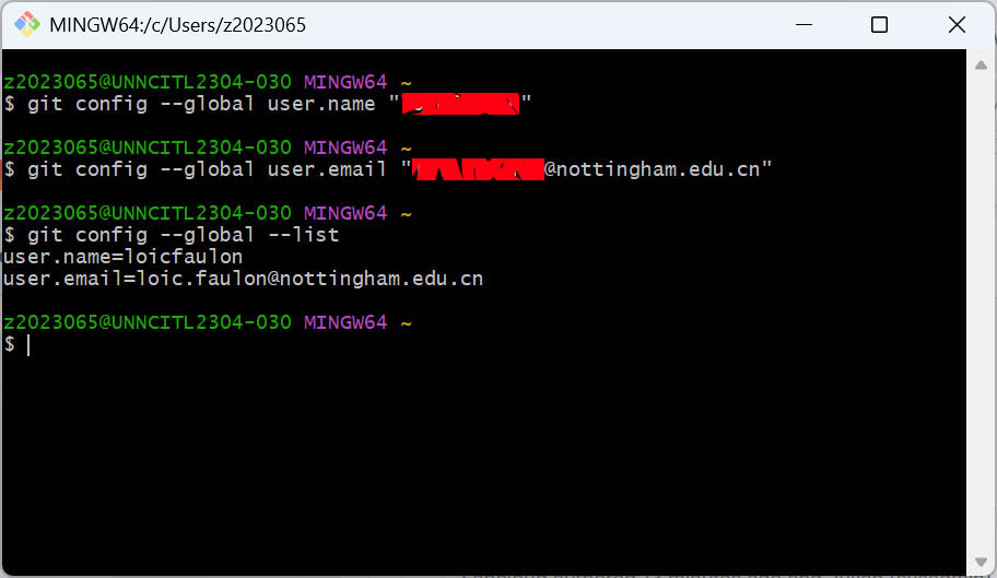 git config --global user.email “MyName@nottingham.edu.cn”- Then, to check if the configuration is complete, I ran the following command: