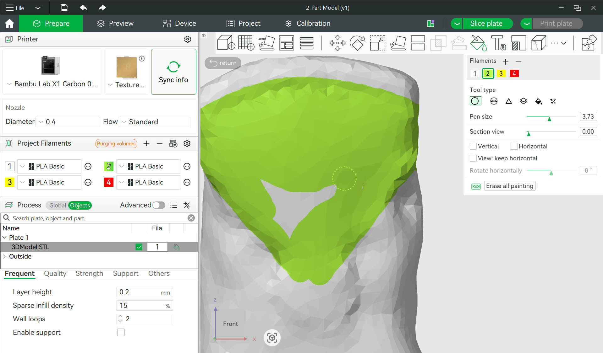 Step 1: Import the STL file into Bamboo Studio and set the parameters. This includes coloring some areas in white and green (similar to my existing my mockup) corresponding to two different color filaments.