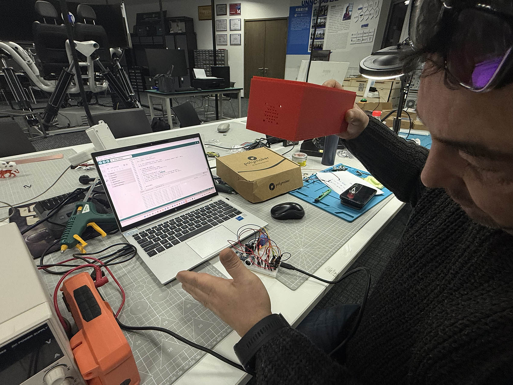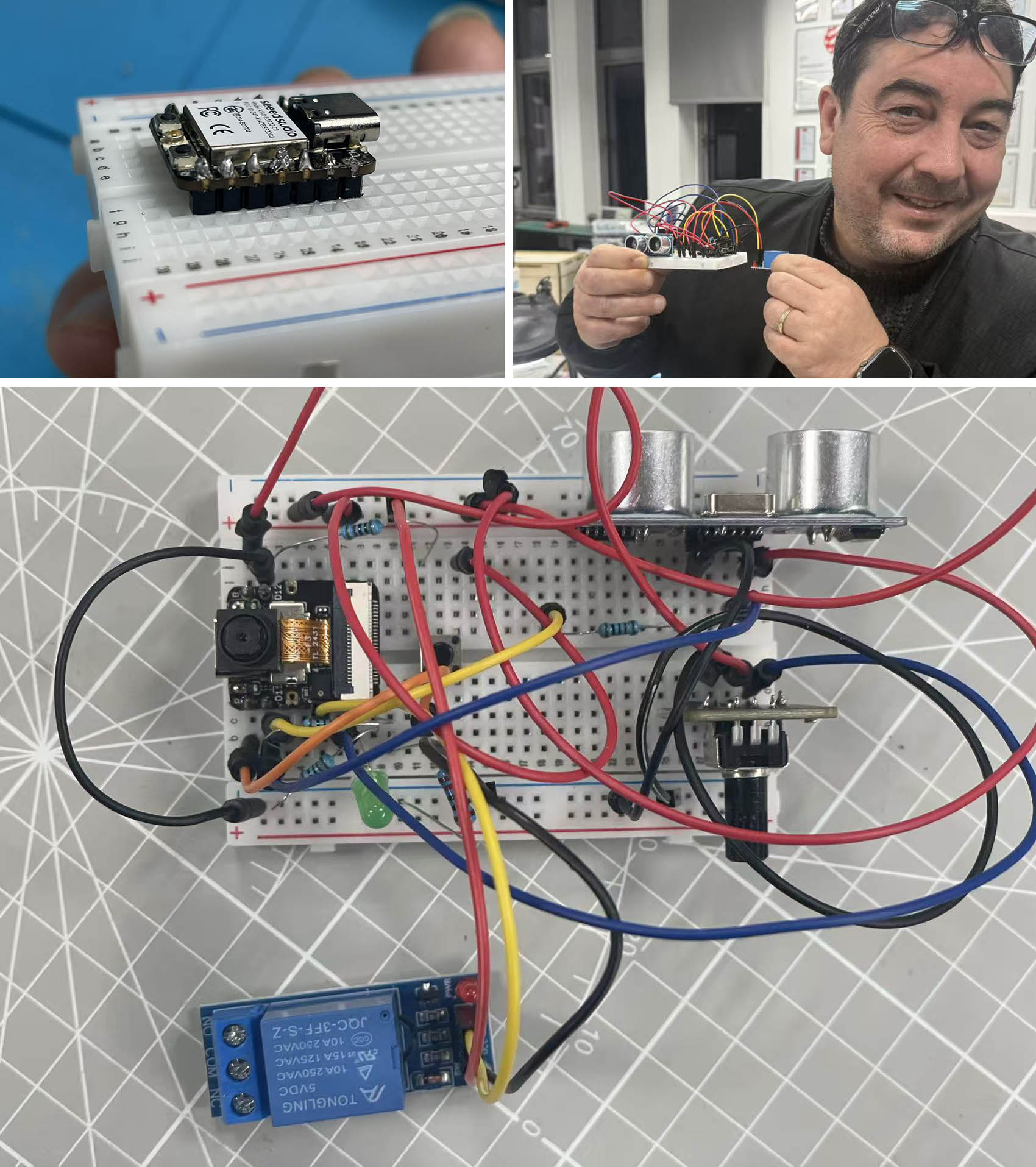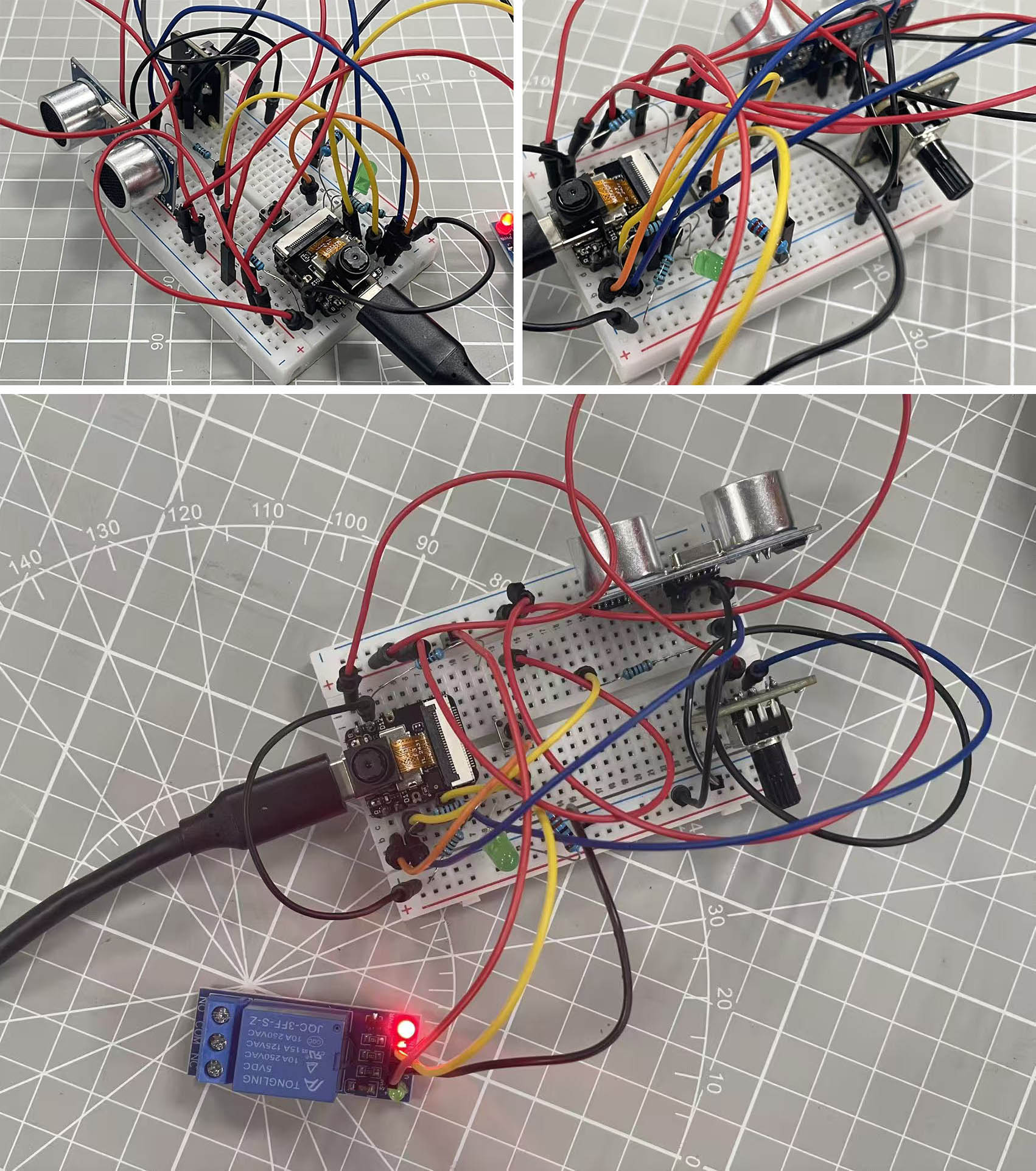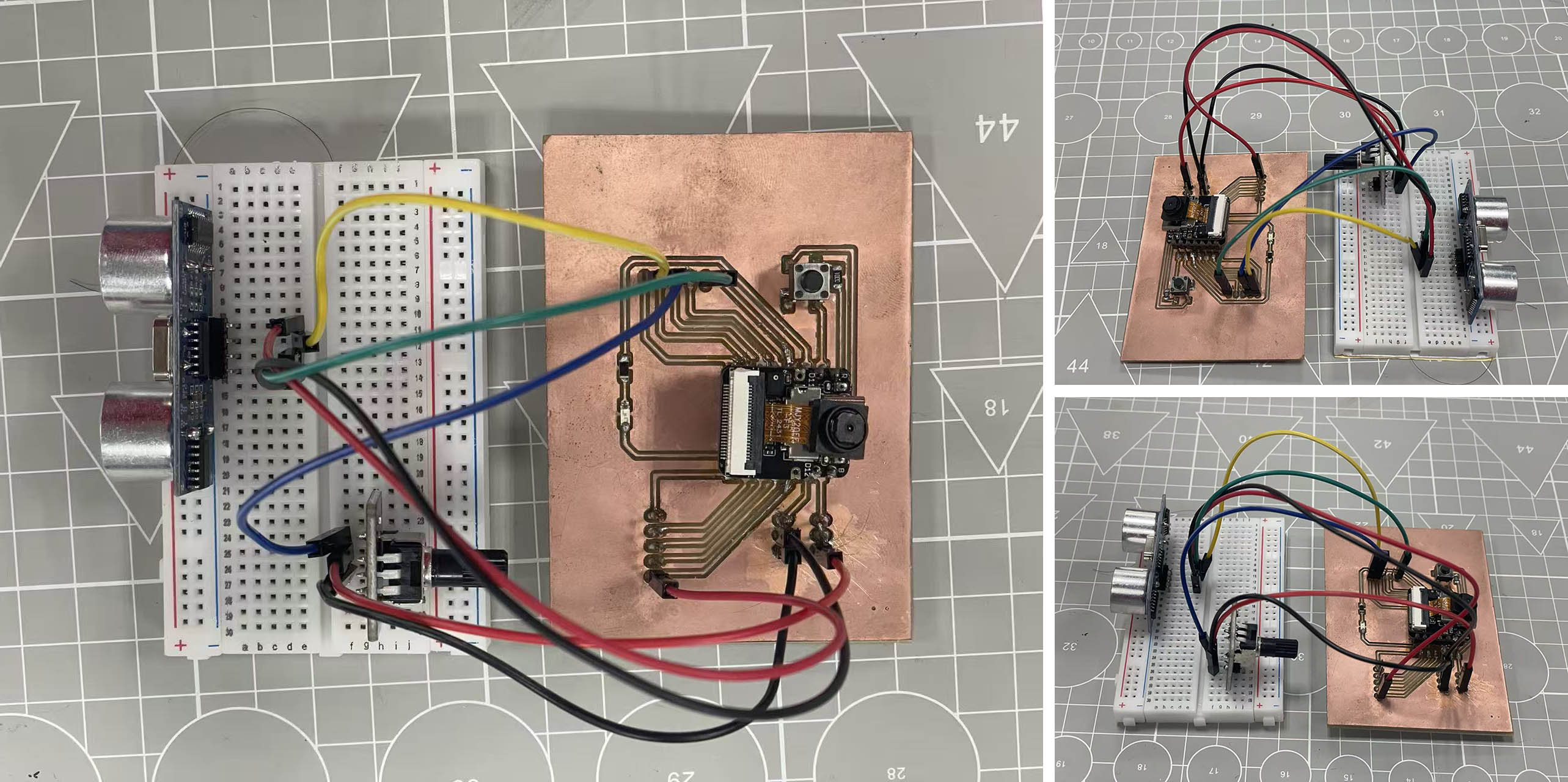 My PCB extension board is now complete with one Xiao ESP32-S3 Sense microprocessor, one LED with one Resistor, one switch with one Resitor, and two 5-Pinhead plus two 3-Pinhead connectors. I use breadboard to help me connect the rest of PART 1 scenario components, such as one Rotational Sensor and one Ultrasonic Sensor, to the PCB extension board.