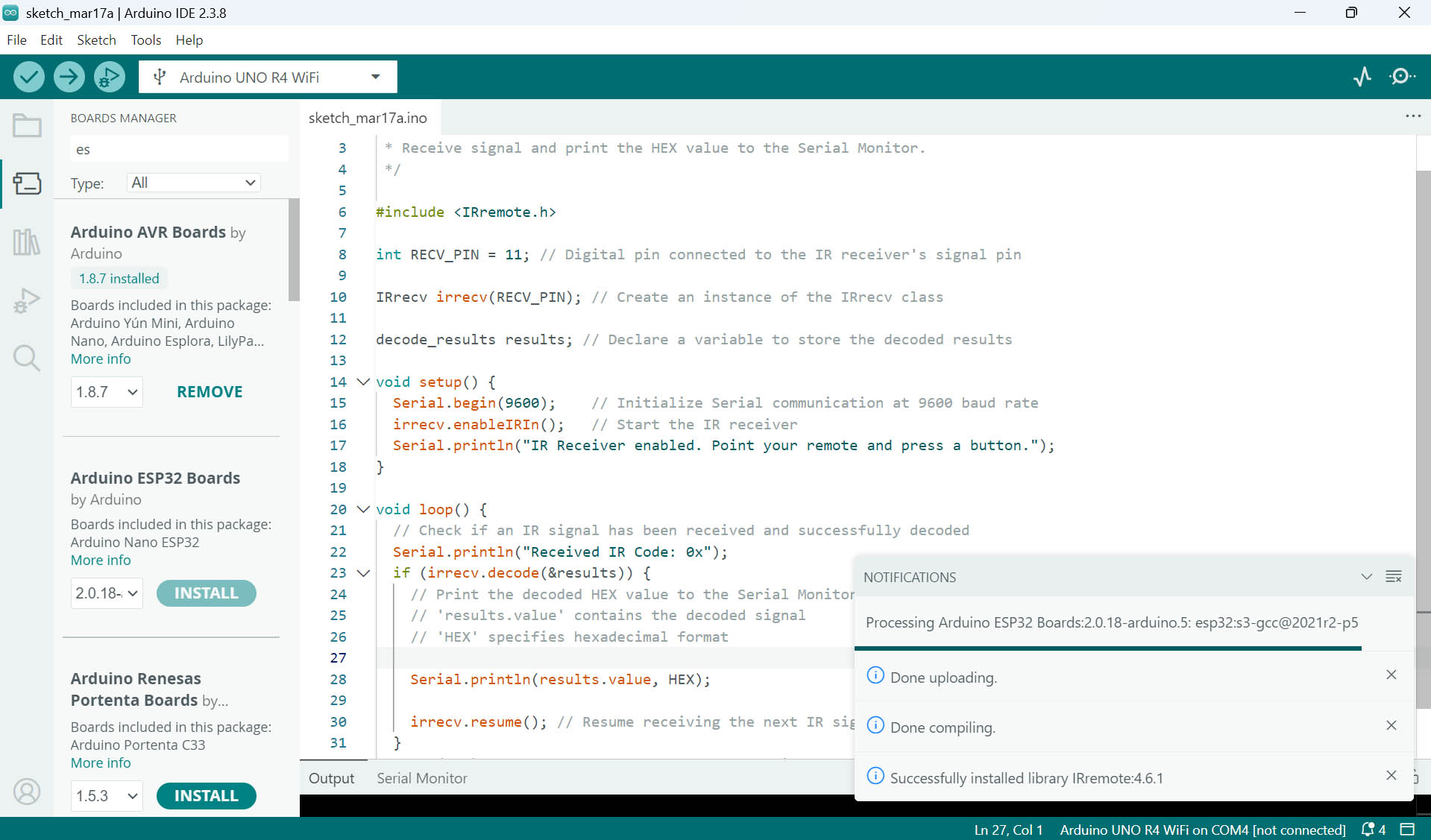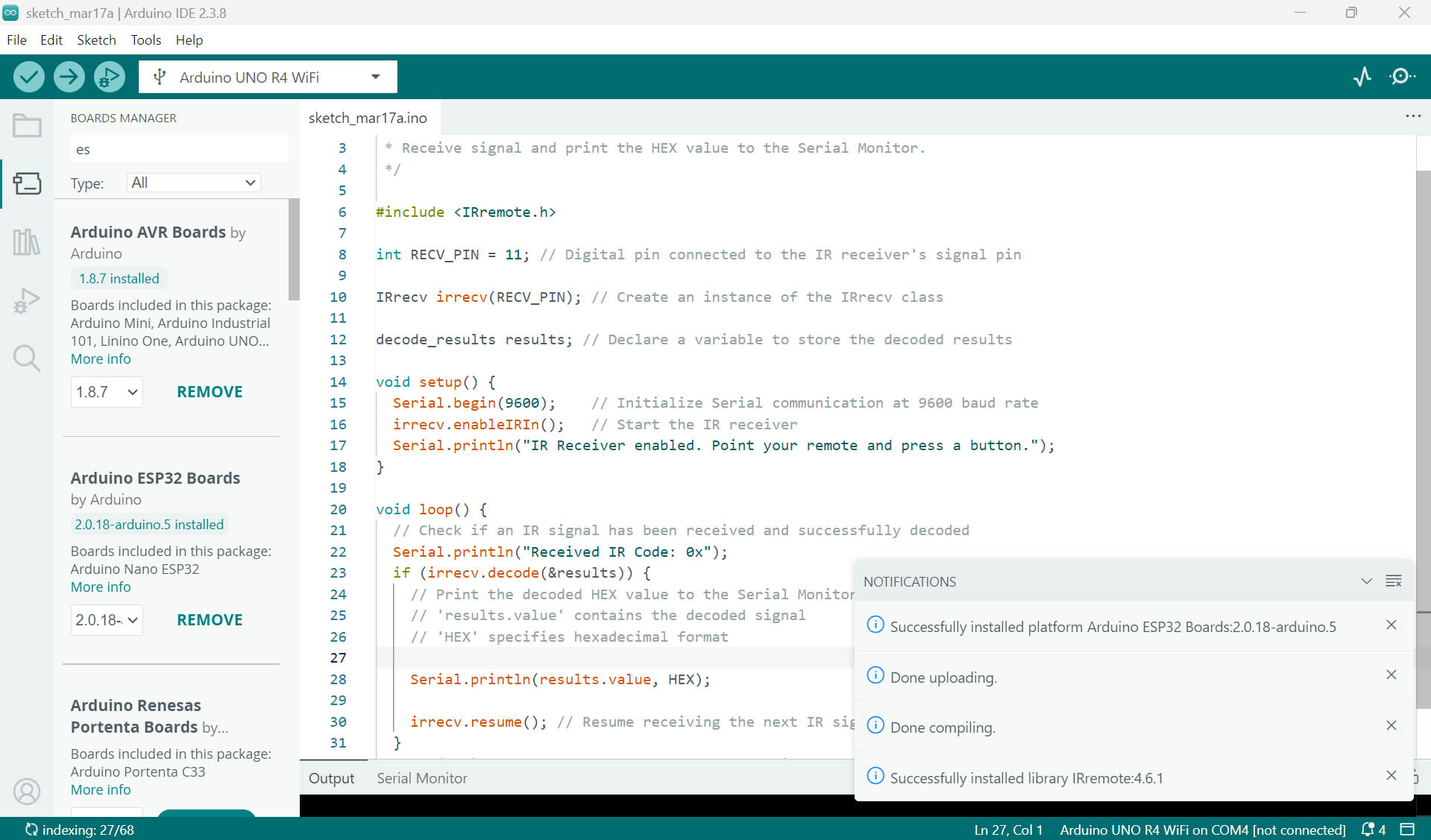😃 😃 😃 SUCCESSFULL DETECTION of the red colour by the camera as we can read in the Arduino IDE's Serial Monitor Output window "OBJECT TOO FAR" if only the red colour is detected, and "ACTIVE" if booth conditions are fulfilled (Red colour + Object within a 25cm distance).