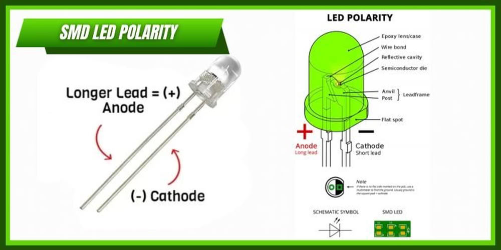 Inside the LED, there are several important components. The outer transparent cover is called the epoxy lens, which protects the internal parts and helps focus the light. Inside the lens, there is a semiconductor die that forms the PN junction where light is produced. When electric current passes through this junction, electrons and holes combine and release energy in the form of light. The reflective cavity inside the LED helps direct the light outward to make it brighter. The anvil post and lead frame support the semiconductor chip and connect it to the external leads. There is also a flat spot on the LED body that helps identify the cathode side.