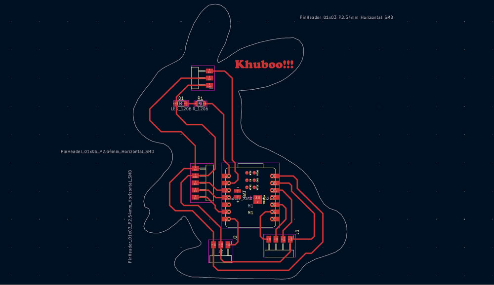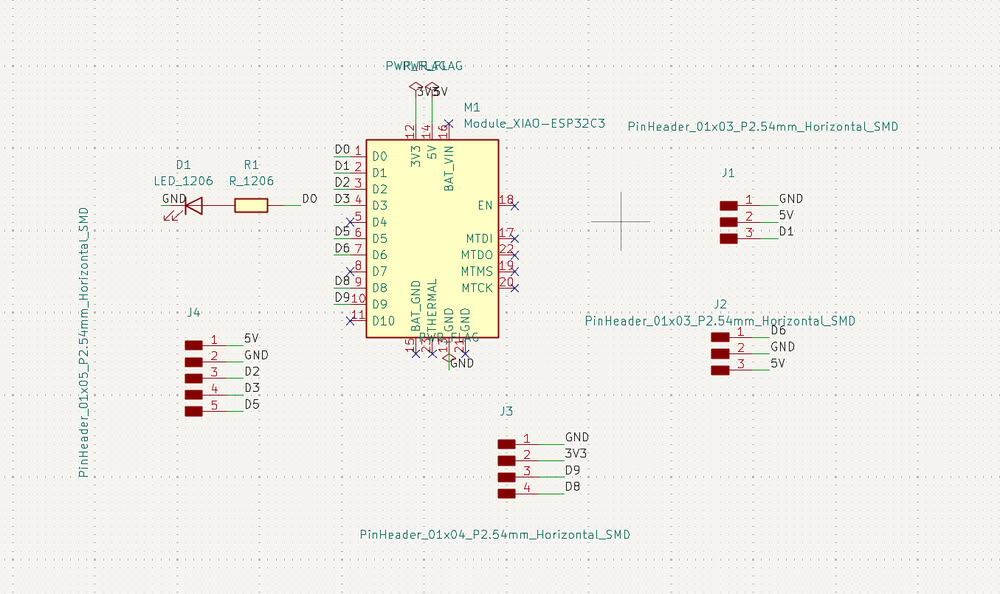 I have created the schematic diagram of my PCB. I placed the ESP32-C3 on the board and then added other components from the symbol libraries, such as a 3-pin header, a 4-pin SMD header, a 5-pin header, one LED, and one resistor. I also labeled the pins, like GND, VCC, D0, D1, as shown in the diagram.
