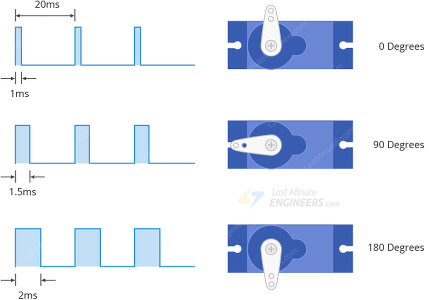 - The signal pin is used to control the movement of the servo motor. It receives Pulse Width Modulation (PWM) signals from the microcontroller such as ESP32 or Arduino. Based on the PWM signal, the servo motor rotates to a specific angle between 0 degrees and 180 degrees.