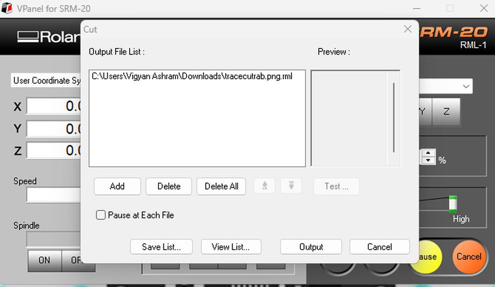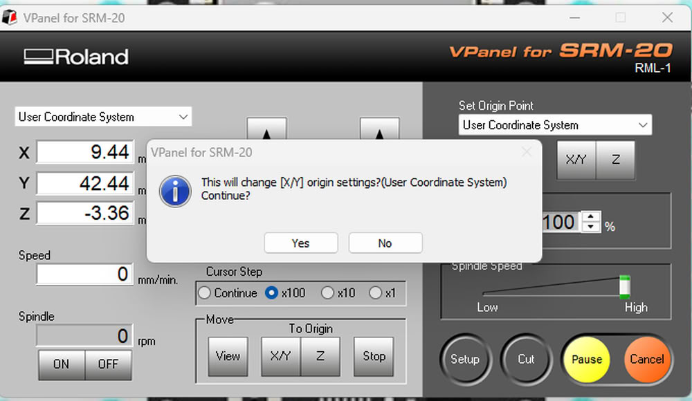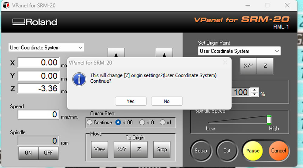 Then I set the speed to 4 mm/s and defined the origin coordinates as X = 0, Y = 0, Z = 0. After that, I configured the settings by turning off the top button and enabling the bottom one to prepare the file for saving. Finally, I clicked on Calculate, which generated the toolpath and saved the .rml file.
