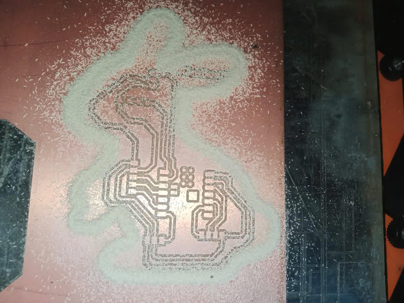 The soldering process is used to attach electronic components to the PCB after the board is milled. First, the milled PCB is cleaned properly to remove dust or copper particles. Then all the required components such as resistors, LEDs, microcontroller, and connectors are placed on their respective pads according to the schematic design. A soldering iron is heated and solder wire is applied to the joint where the component lead and copper pad meet. The heat melts the solder, allowing it to flow around the component lead and pad, creating a strong electrical and mechanical connection. This process is repeated for all components on the board. After soldering, the board is visually inspected to ensure there are no loose connections, excess solder, or short circuits between the pads.