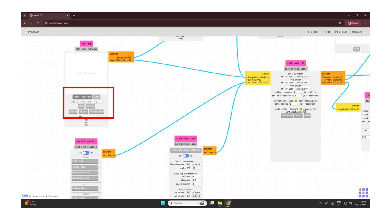 Similarly, I uploaded the Edge.Cuts PNG file into Mods CE to generate the toolpath for cutting the PCB outline. After selecting the PNG file, I chose the 1/32 cutout tool option since a 1/32 milling bit is used for cutting the board edges.