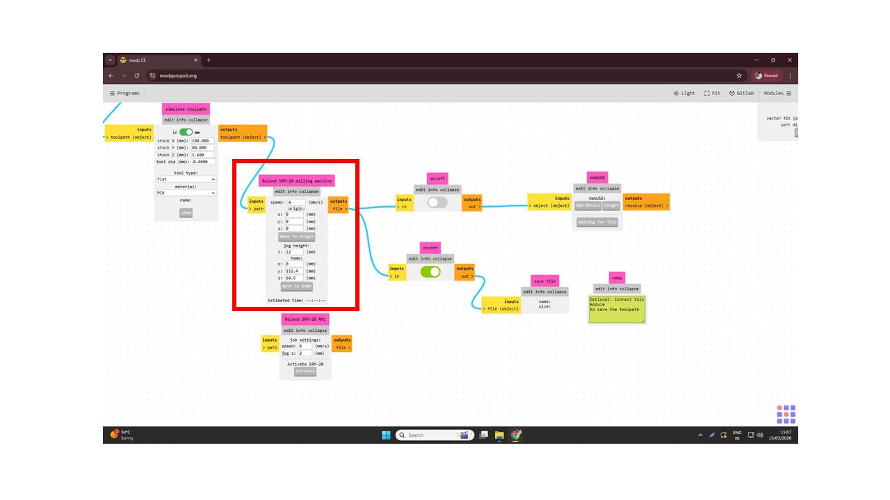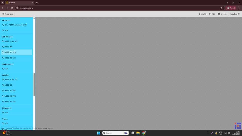 I opened mods ce then click on programs and select machine I am using for pcb making.