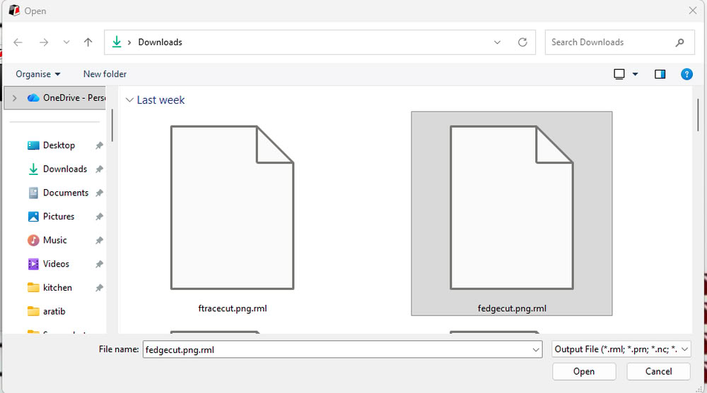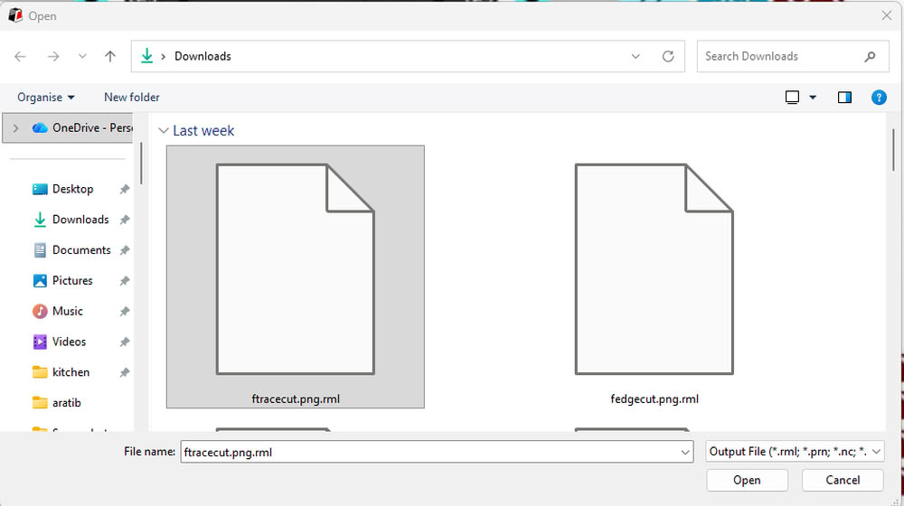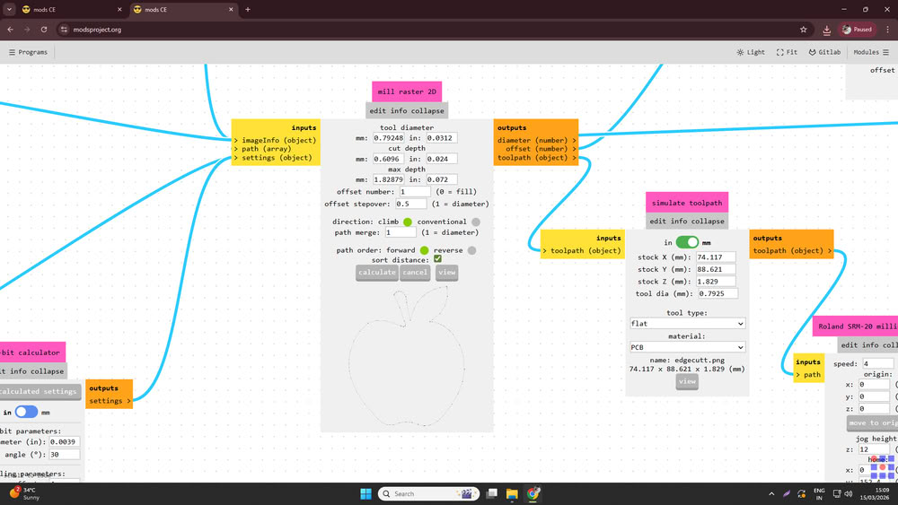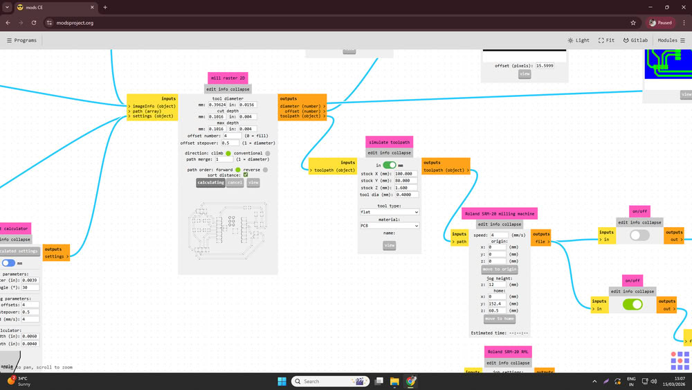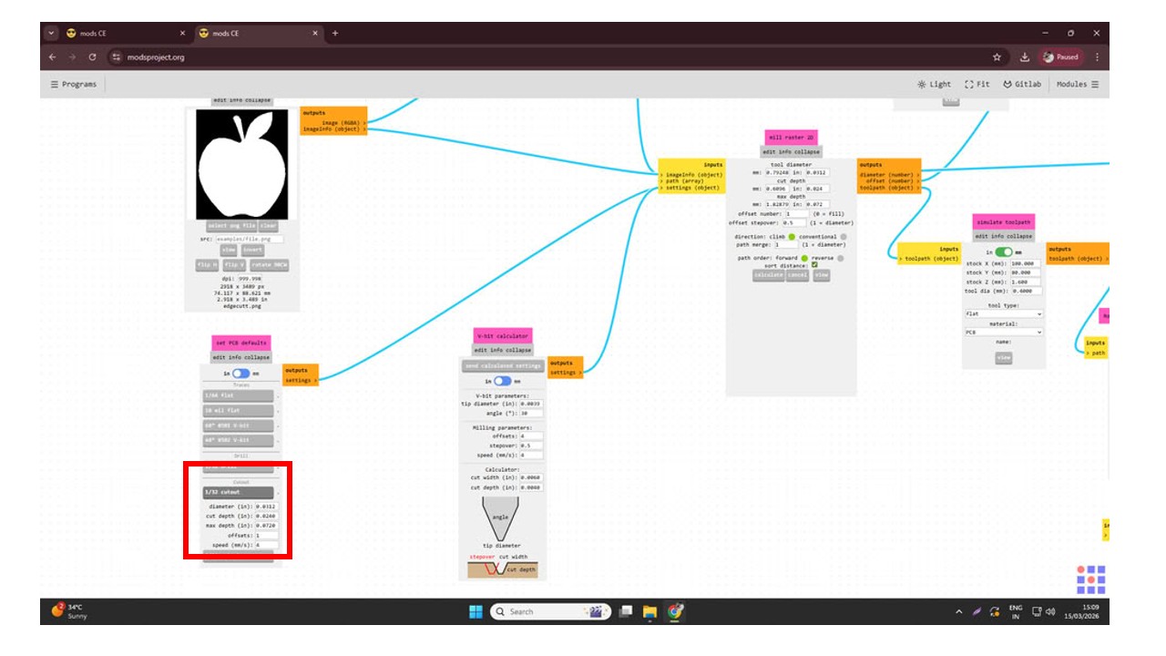 Similarly, I uploaded the Edge.Cuts PNG file into Mods CE to generate the toolpath for cutting the PCB outline. After selecting the PNG file, I chose the 1/32 cutout tool option since a 1/32 milling bit is used for cutting the board edges.