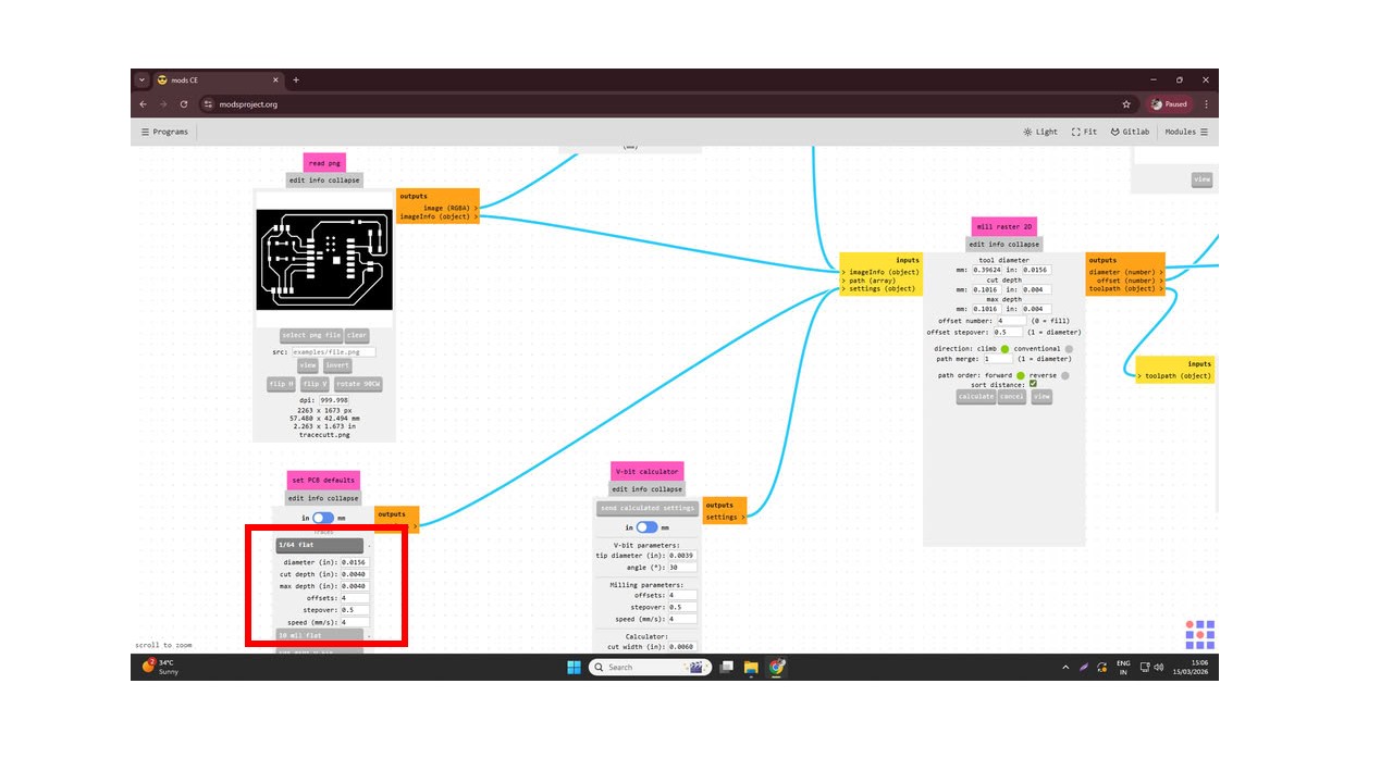 Since I was using a 1/64 milling bit for cutting the PCB traces, I selected the 1/64 tool option.