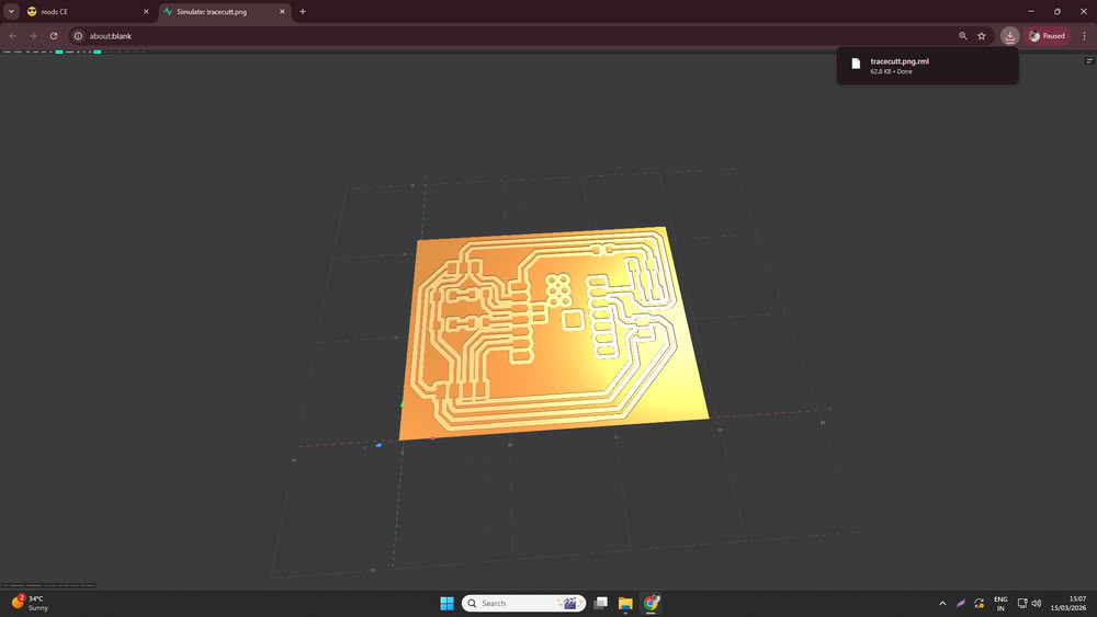 Task:During this week, we explored the electronics production process, especially PCB milling. First, we studied the design rules that need to be tested before manufacturing a PCB. For this purpose, we downloaded a test rule PNG file provided on the Fab Academy website by Neil Gershenfeld. After downloading the file, we used Mods CE to generate the milling toolpath from the PNG image. Next, we prepared the PCB milling setup by installing the required machine software, connecting the machine, and setting the correct origin position. Then the milling process was started using the generated toolpath file. After the milling was finished, we carefully observed the result to evaluate and understand the PCB design rules and milling accuracy.