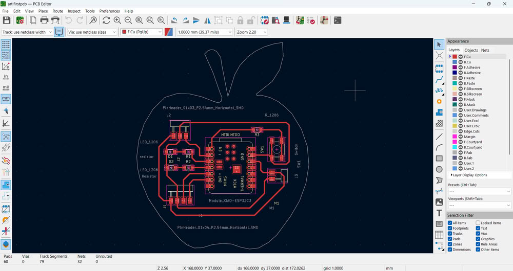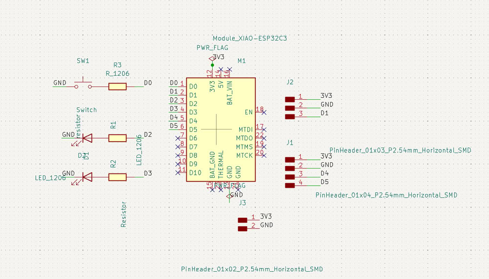 I designed the schematic for my custom development board using KiCad in electronic design assignment. The main controller used in this circuit is the Seeed Studio XIAO ESP32C3 microcontroller module. This module provides multiple GPIO pins which are used to connect input and output components.In the schematic, I added a push button switch (SW1) connected to a GPIO pin through a resistor (R3). The switch is used as an input device. Two LEDs are included as output indicators, each connected in series with a current limiting resistor (R1 and R2) to protect the LEDs from excess current.