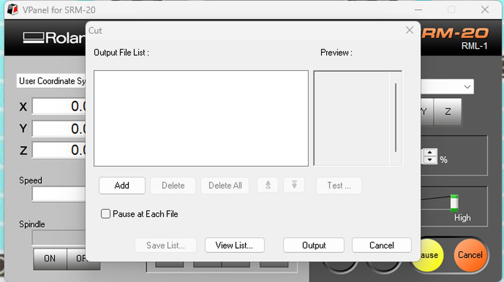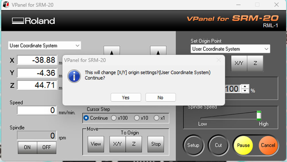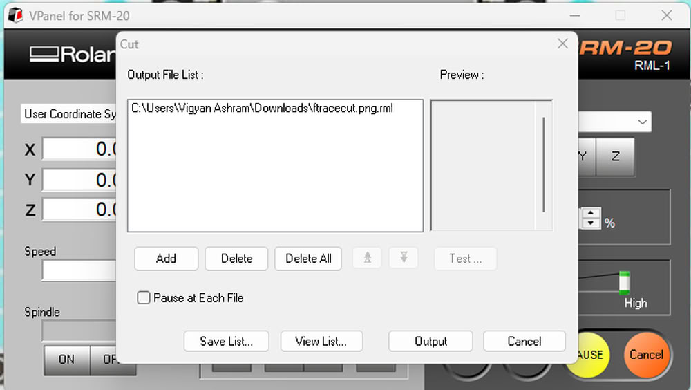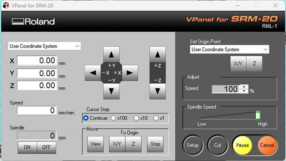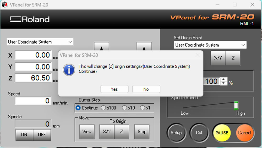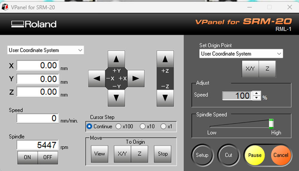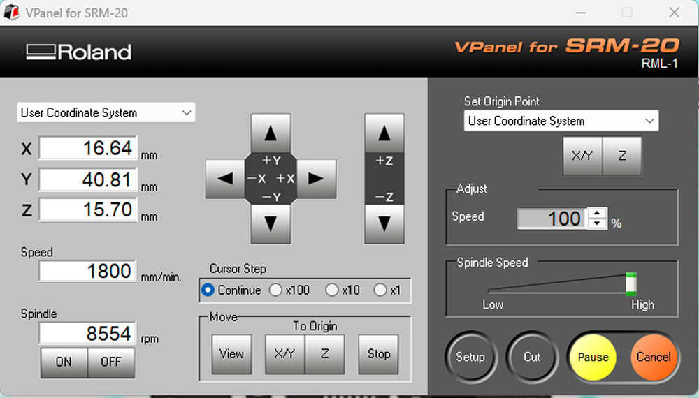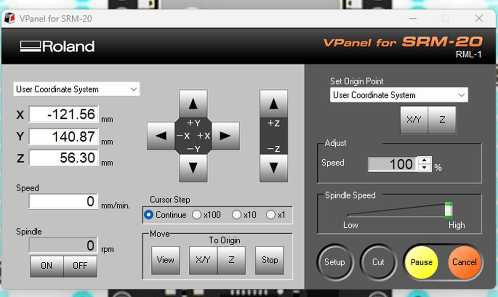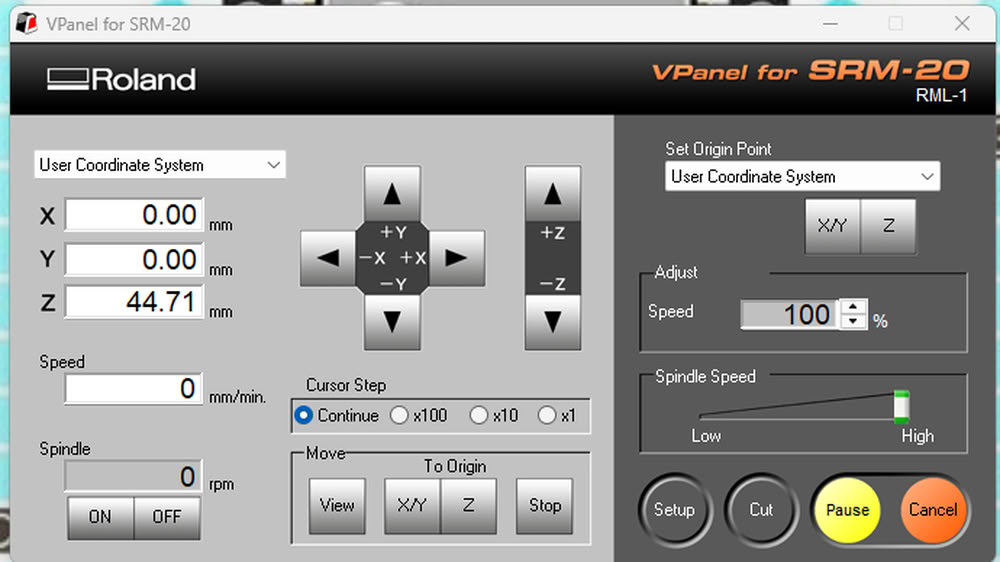 Then I set the speed to 4 mm/s and defined the origin coordinates as X = 0, Y = 0, Z = 0. After that, I configured the settings by turning off the top button and enabling the bottom one to prepare the file for saving. Finally, I clicked on Calculate, which generated the toolpath and saved the .rml file.