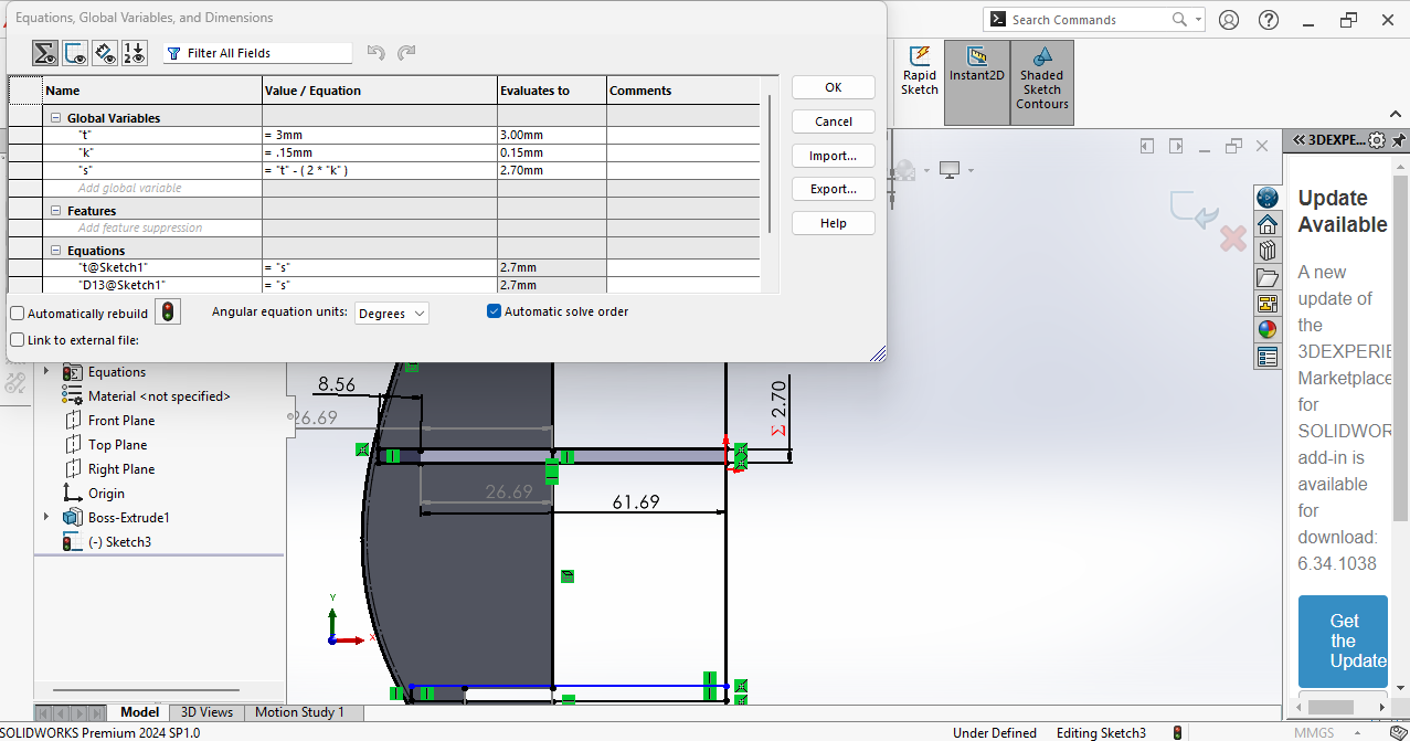 I opened the Equation Manager and added parameters such as material thickness, slot width, and kerf value. By linking these dimensions to equations, I made the design parametric, so if