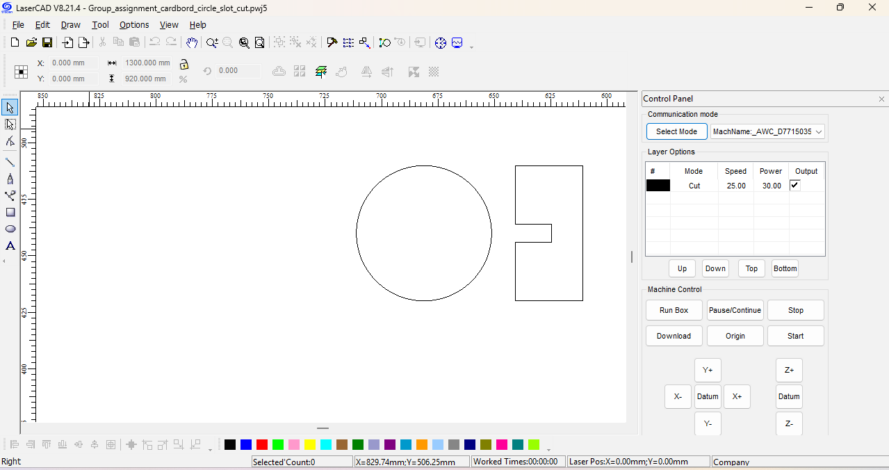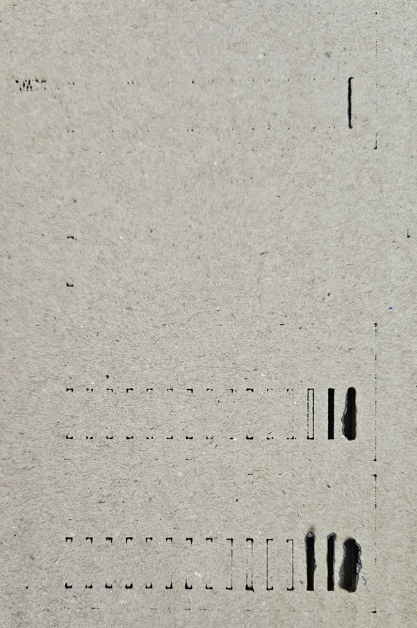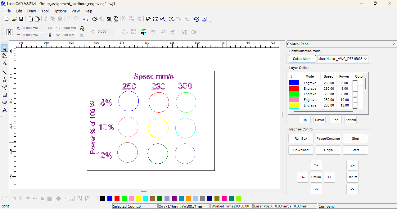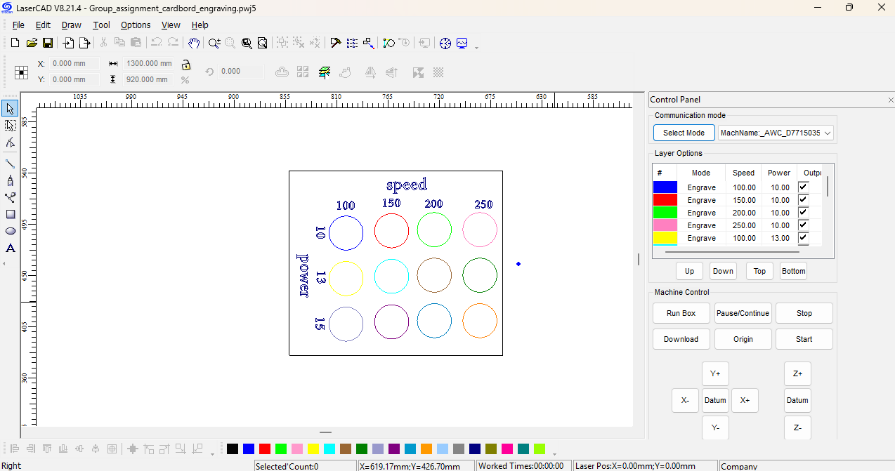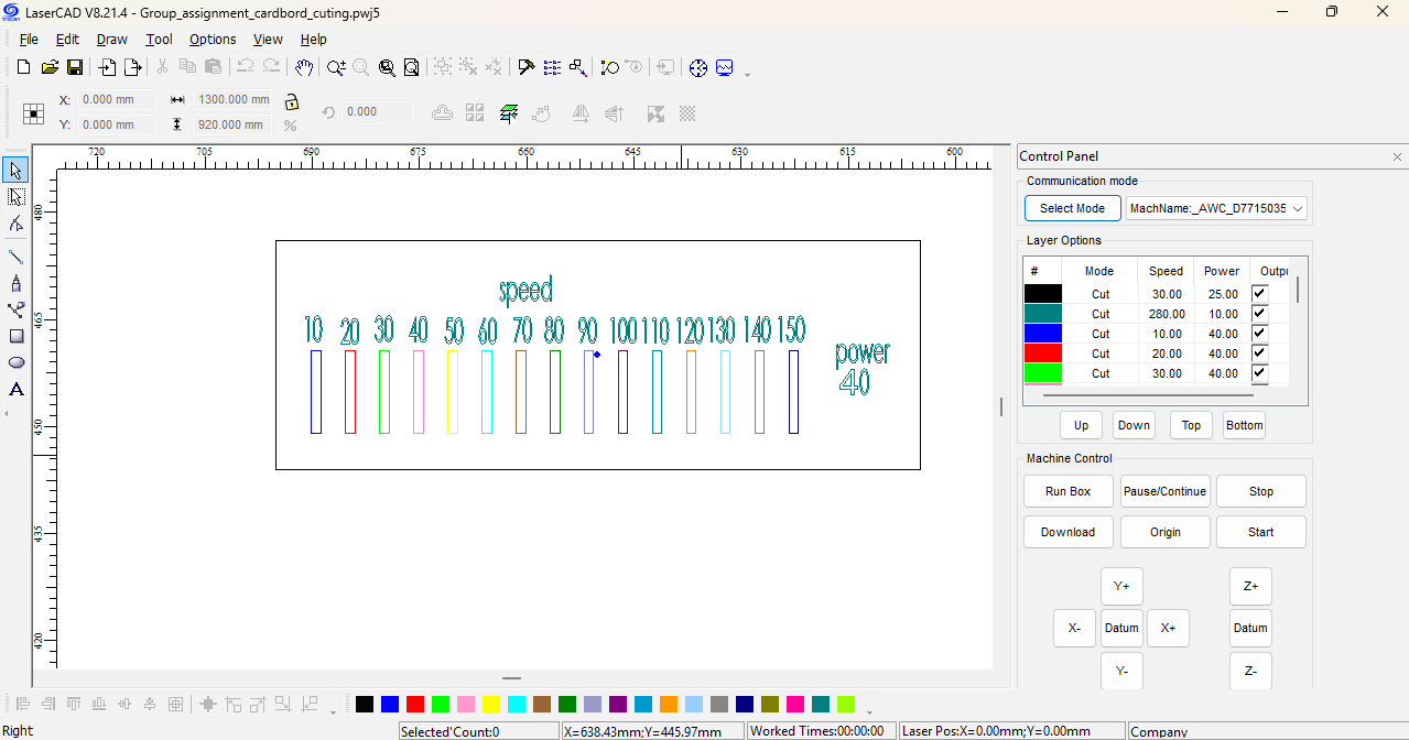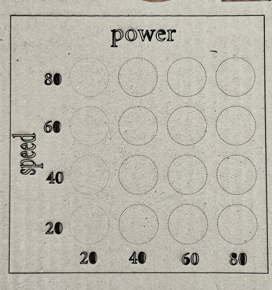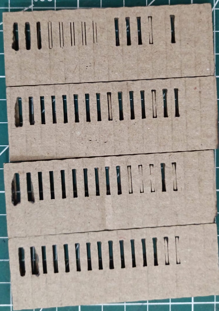 This file was used to cut 4 mm thick cardboard using different power and speed settings. Multiple test cuts were performed to observe how changes in laser power and cutting speed affect the cutting quality, depth, and edge finish.