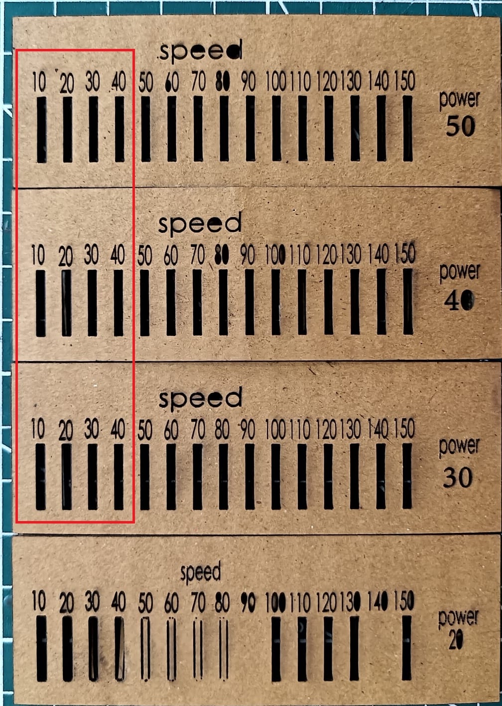 Conclusion: For 4 mm cardboard, the best cutting results were achieved when the machine was operated at a speed between 10–30 and power between 30–40.