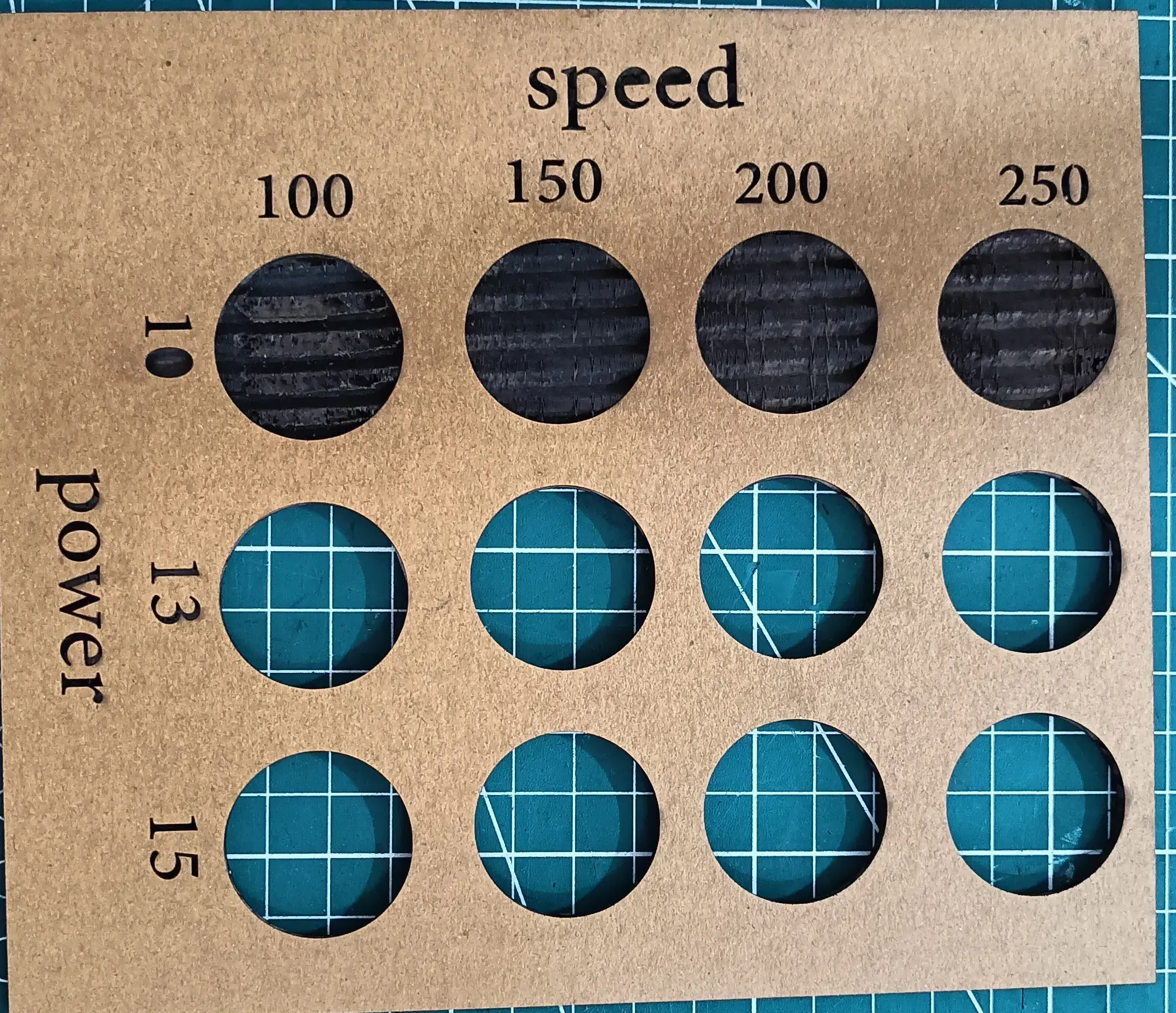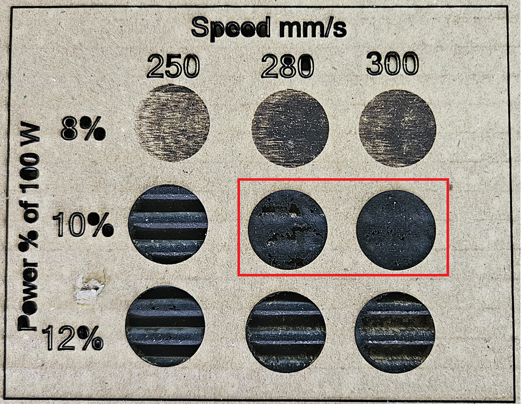 Conclusion: Good quality engraving on 4 mm cardboard was achieved at a speed of 280–300 and power of 10%.