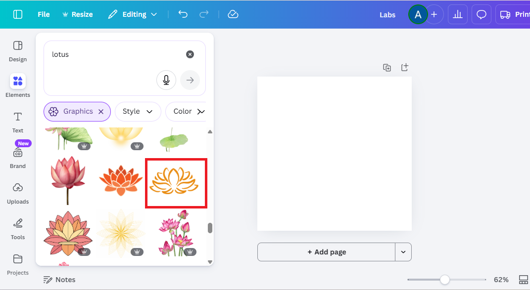 After opening Canva, I went to the Elements section and searched for a lotus flower. I selected a simple and clean lotus flower design that matched my idea.