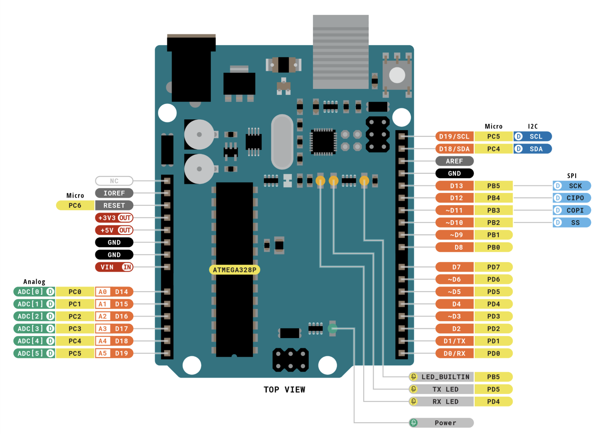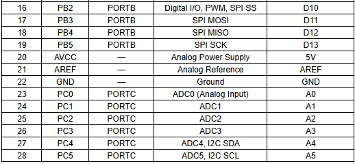 Other pins are used for communication protocols such as SPI, I2C, or UART to connect with external devices.