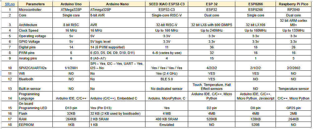 I compared their architecture, clock speed, memory size, and communication features. This helped me see how to choose the right microcontroller for different applications.