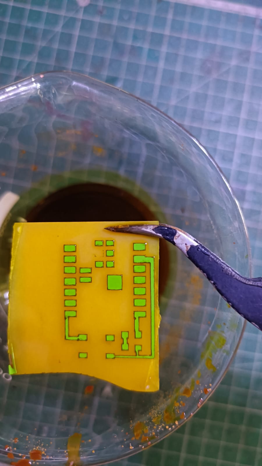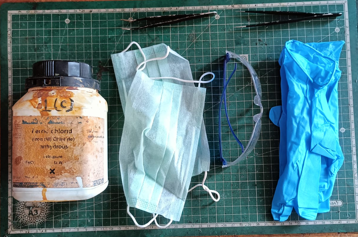 The next step was the chemical etching process. For this step, we followed proper safety precautions because chemicals were involved. We used ferric chloride solution mixed with distilled water to remove the unwanted copper from the board.