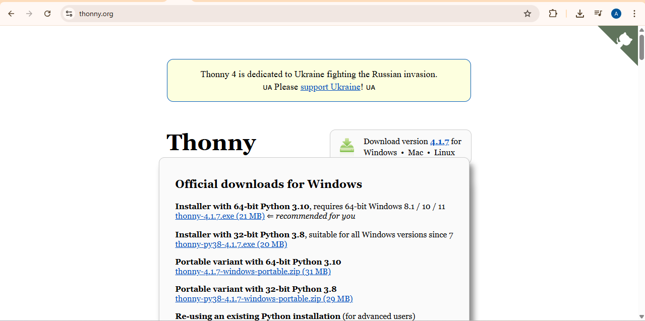 used the ESP32 board to blink an LED using Thonny and MicroPython. To install Thonny on a Windows PC, we first went to the official Thonny website.