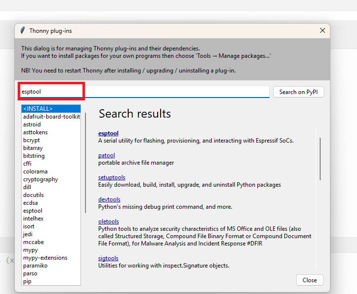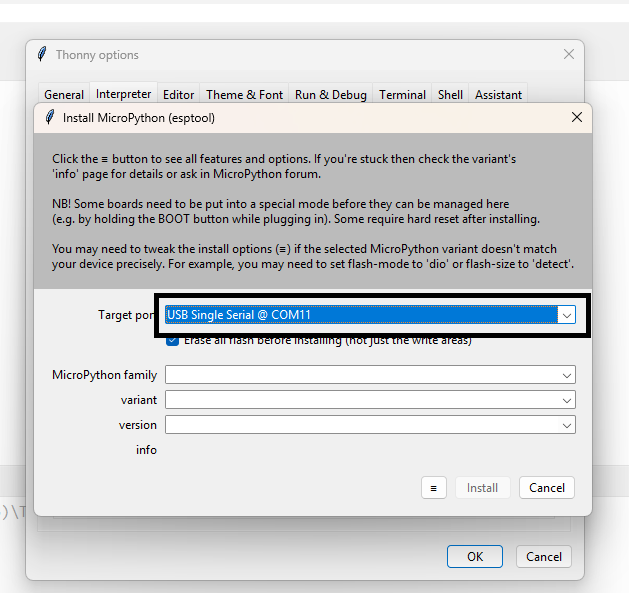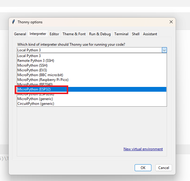 Check your ESP32 module type, select the correct device in Thonny, and then install the MicroPython firmware if required.