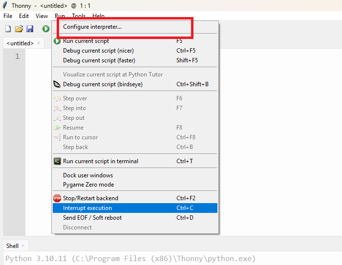 Next, go to Tools → Options → Interpreter to configure the interpreter settings.