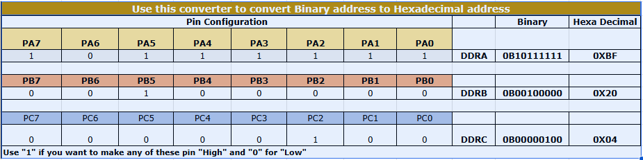 This chart was made by Kiran Sir during Fab Academy 2022. It helps us understand how binary and hexadecimal values are used for microcontroller port pins.