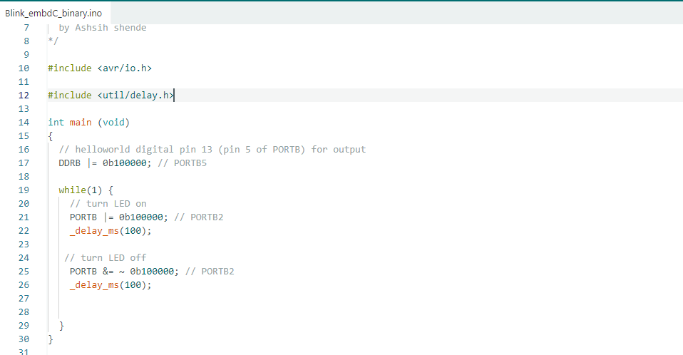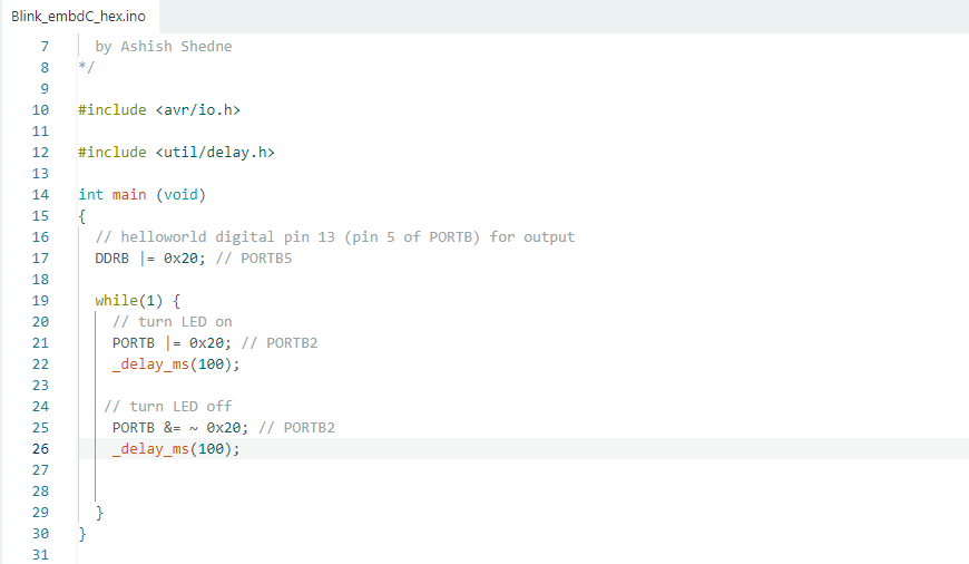 Arduino blink program using hexadecimal values to control the onboard LED.