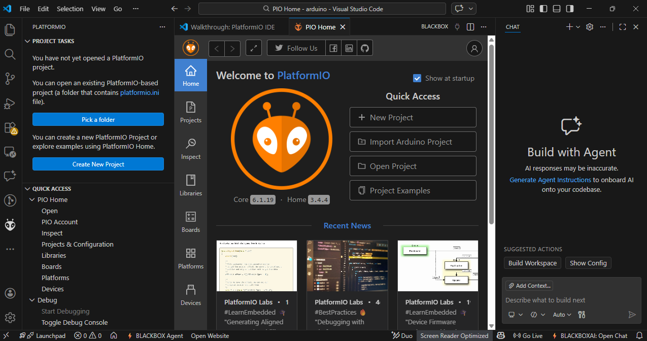 After installing, click on the PlatformIO icon, then create a new project and give your project a name.