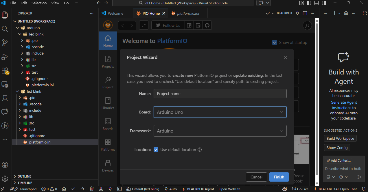 In the next step, select your board type and choose the appropriate framework (such as Arduino). click on Finish to create the project.
