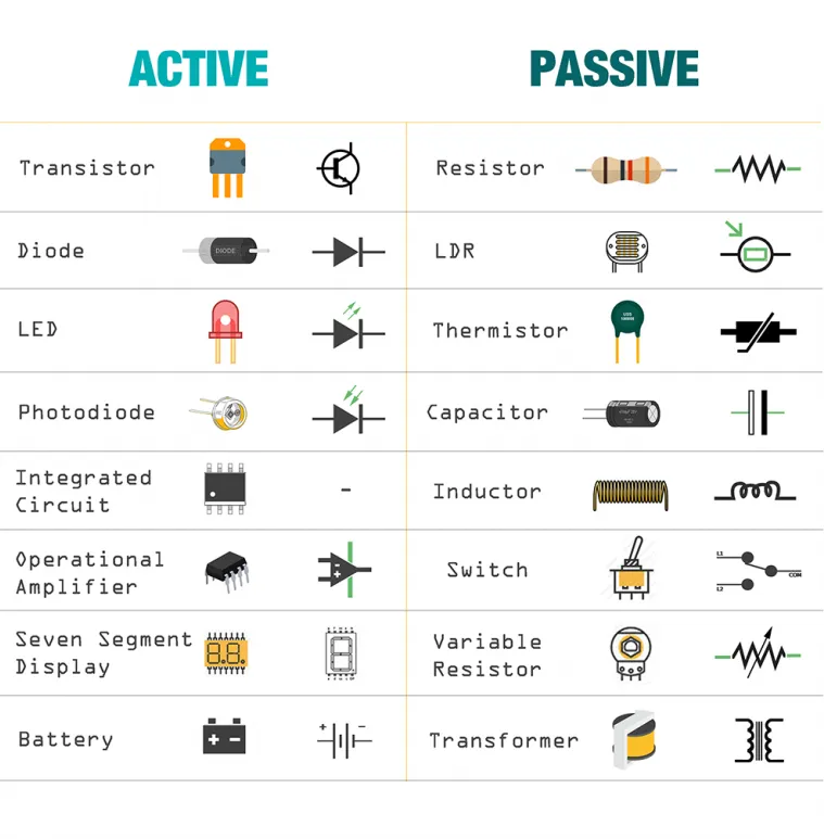 Examples of active components include transistors, diodes, and integrated circuits (ICs). These components are essential for creating complex electronic devices and systems.