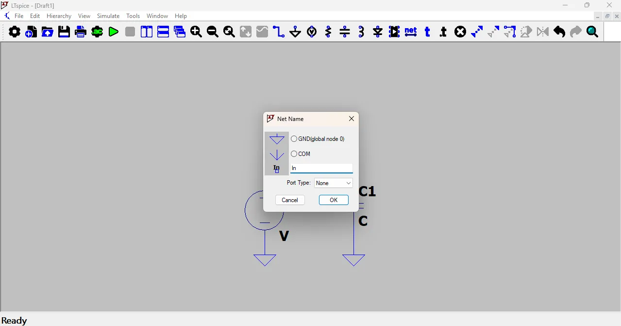 To connect voltage and GND, place the voltage source, then connect its negative terminal to GND (global node 0) using the ground tool.