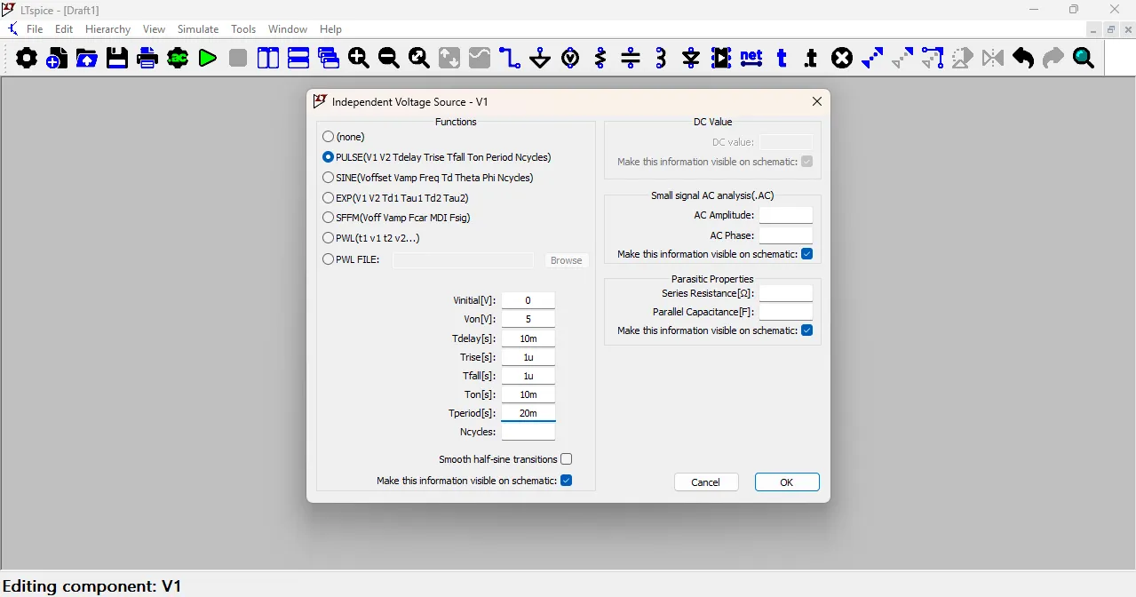 then select the PULSE option and enter the values as shown in the image below. After entering all the values, click OK to close the window.
