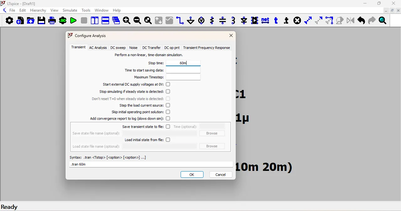 This value will appear in the schematic as .tran 60m which means the transient simulation will run for 60 milliseconds.