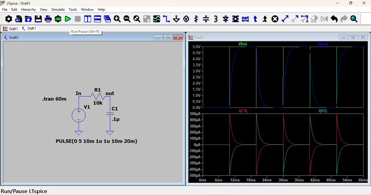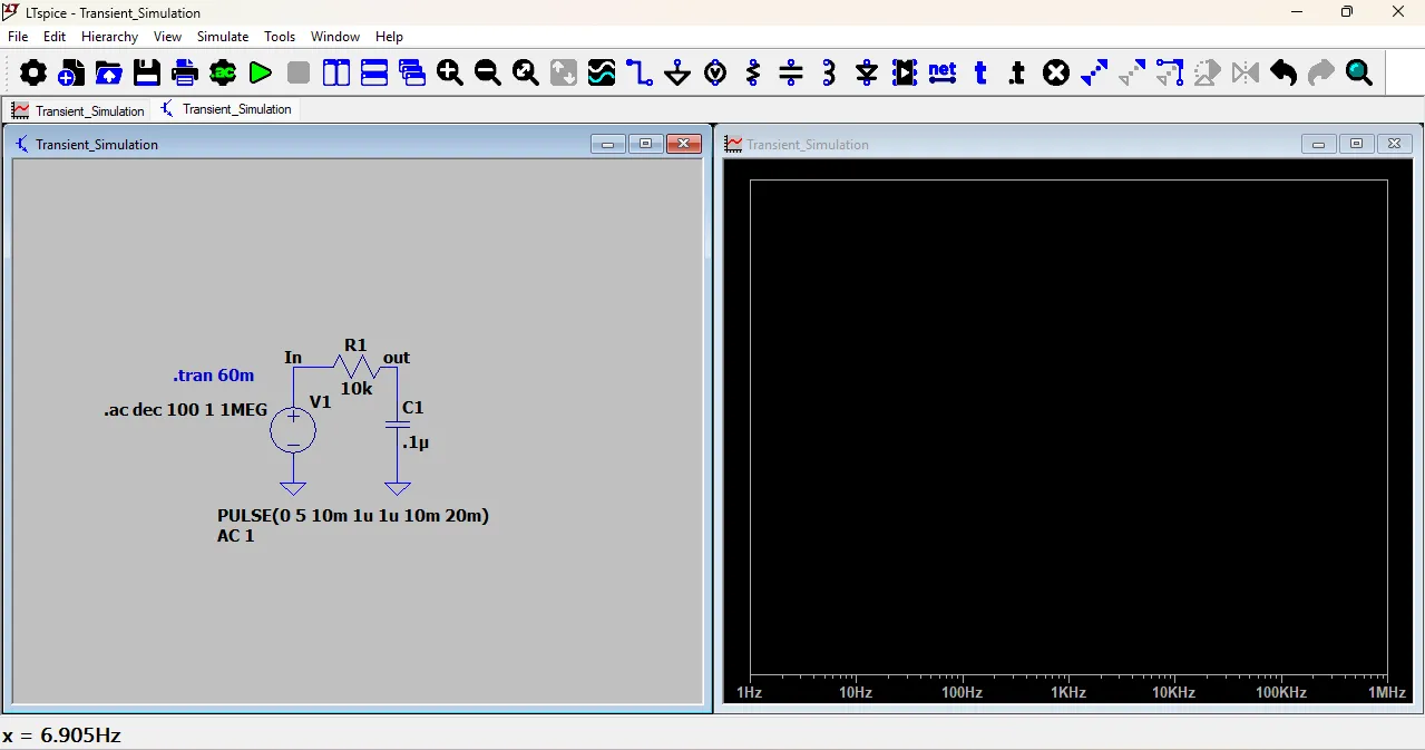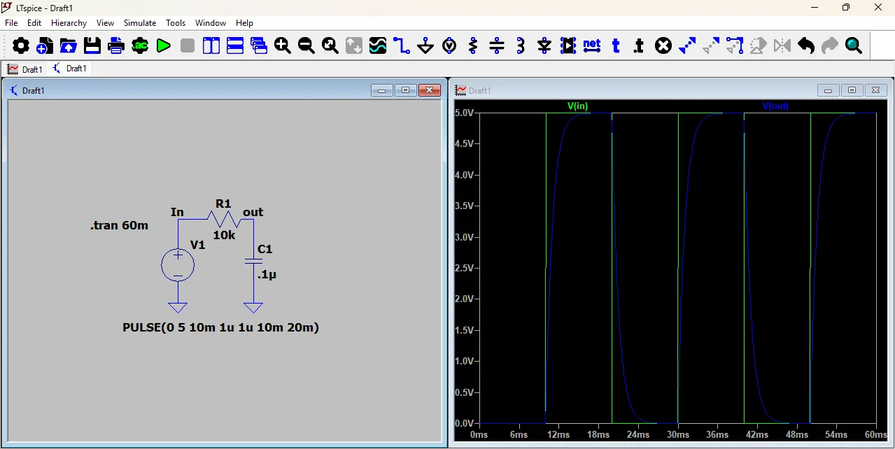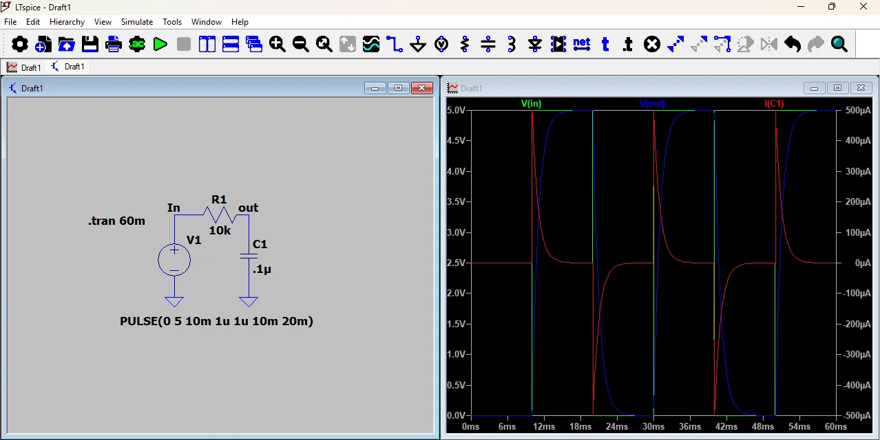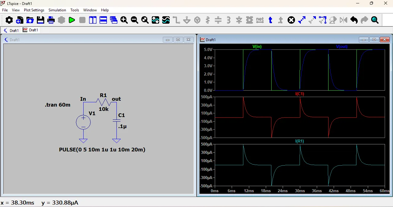 After a few seconds, a new window will open showing the waveform of the circuit. You can analyze the voltage and current changes over time using this graph.