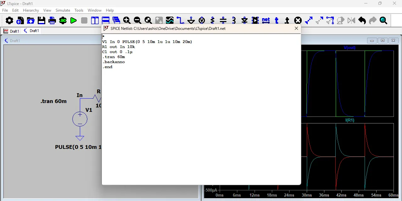 To see the resistor current, I clicked on the resistor symbol, and its current waveform appeared in the second graph. Since the resistor current was shown in the negative direction, I checked the current direction by going to View → SPICE Netlist, where the component connections and current direction are defined.