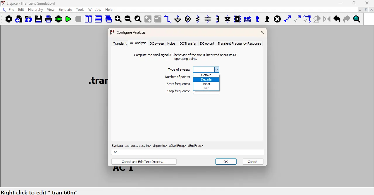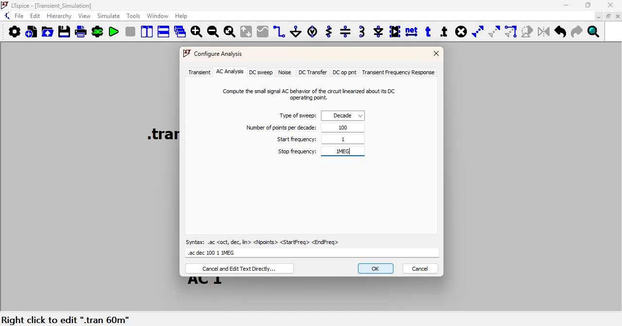 In the AC Analysis window, I selected the Type of Sweep as Decade and entered the Start Frequency as 1Hz and the Stop Frequency as 1MHz.