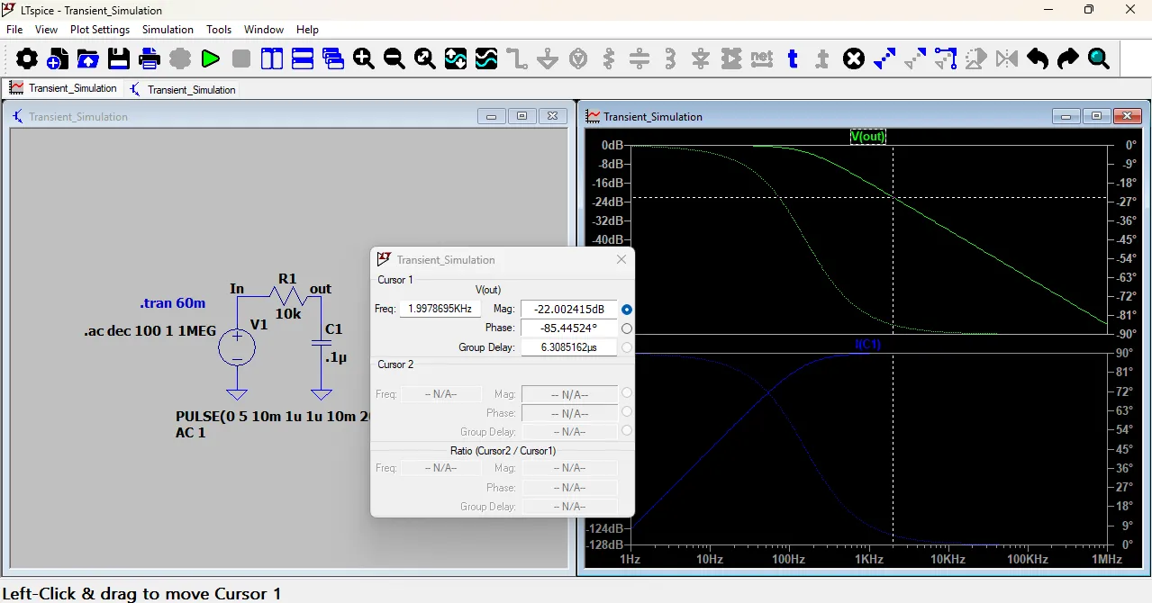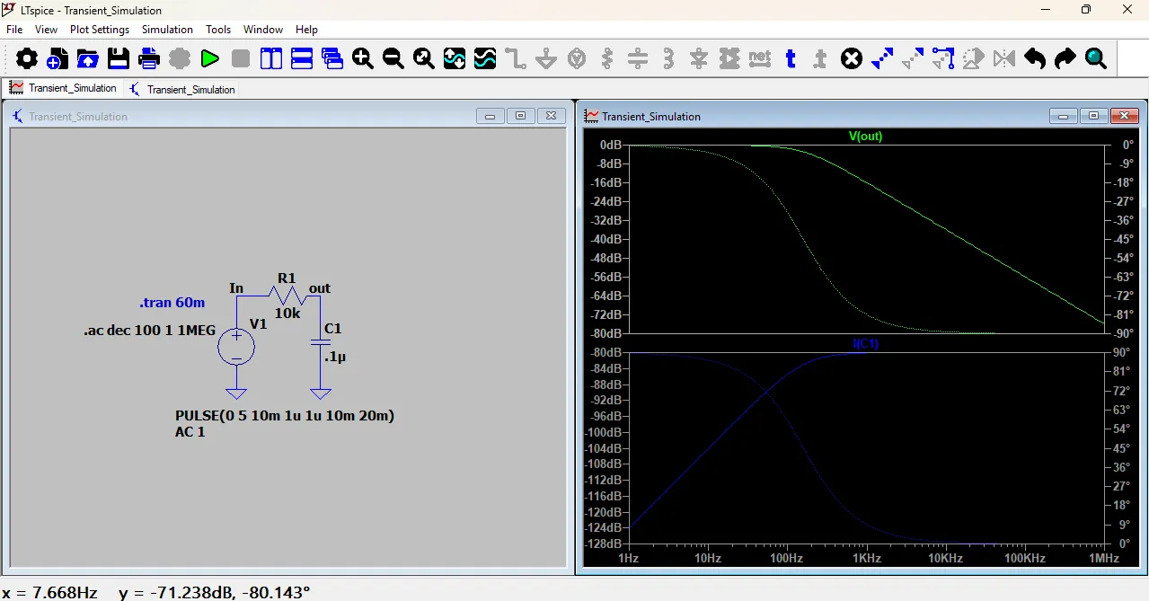 After a few seconds, a new window opened showing the Bode plot of the circuit. The Bode plot consists of two graphs: the magnitude plot and the phase plot.