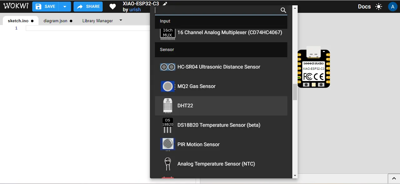 After that, I added the DHT22 sensor to the project and connected it to the ESP32-C3 board according to the correct pin configuration.